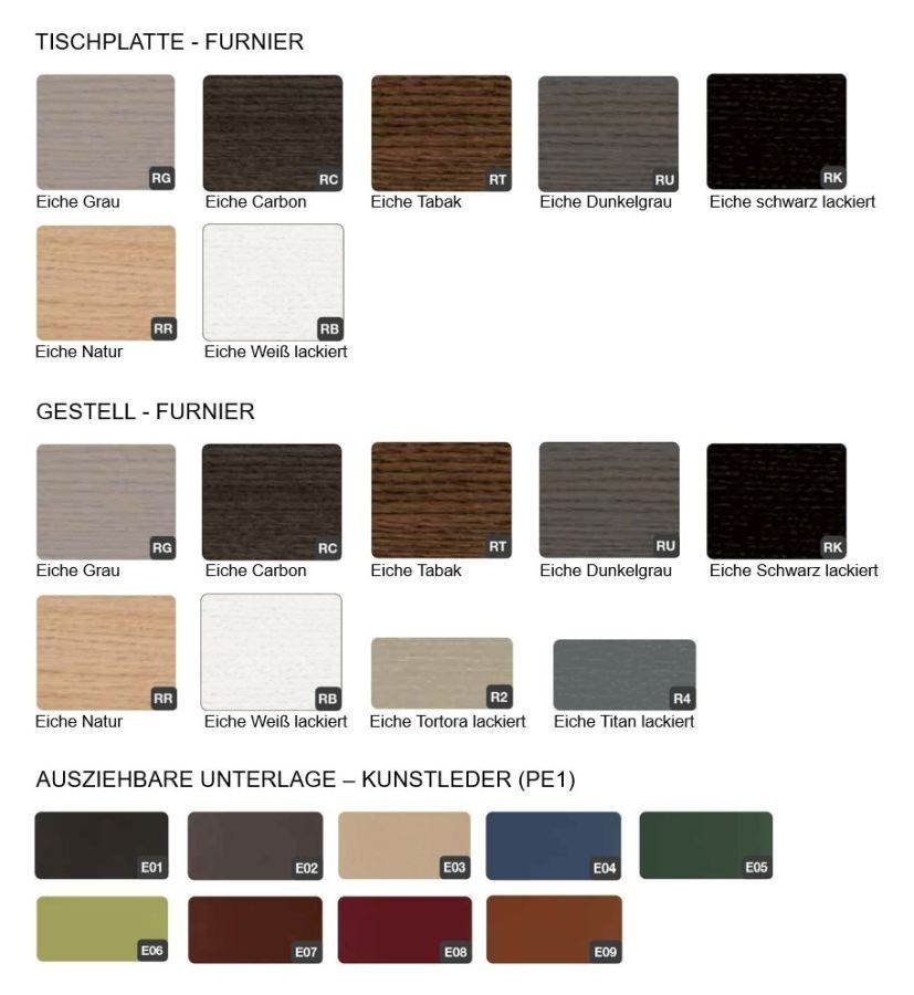 Eiche Weiß lackiert (RB), Eiche Natur (RR), Eiche Grau (RG), Eiche Dunkelgrau (RU), Eiche Carbon (RC), Eiche Tabak (RT)