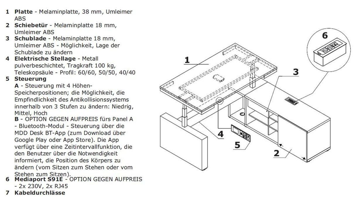 Schreibtisch elektrisch höhenverstellbar mit Sideboard FARO 180/200 x 100 x 74 cm