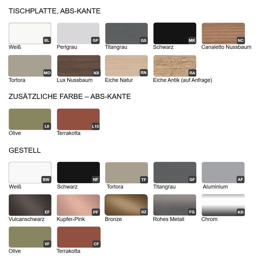 Weiß (BW), Aluminium (AF), Tortora (TF), Titangrau (GF), Schwarz (NF), Vulcanschwarz (EF), Kupfer-Pink (PF), Bronze (BZ)