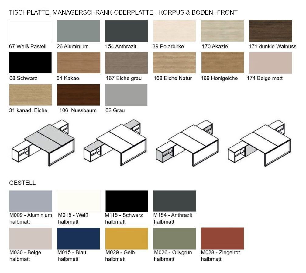 02 - Grau, 08 - Schwarz, 26 - Aluminium Satinato, 31 - Kanadische Eiche, 39 - Polarbirke, 64 - Kakao, 67 - Weiß Pastell