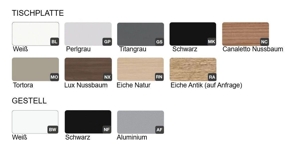 Weiß (BL), Perlgrau (GP), Tortora (MO), Titangrau (GS), Schwarz (MK), Eiche Natur (RN), Canaletto Nussbaum (NC), Lux Nussbaum (NX)