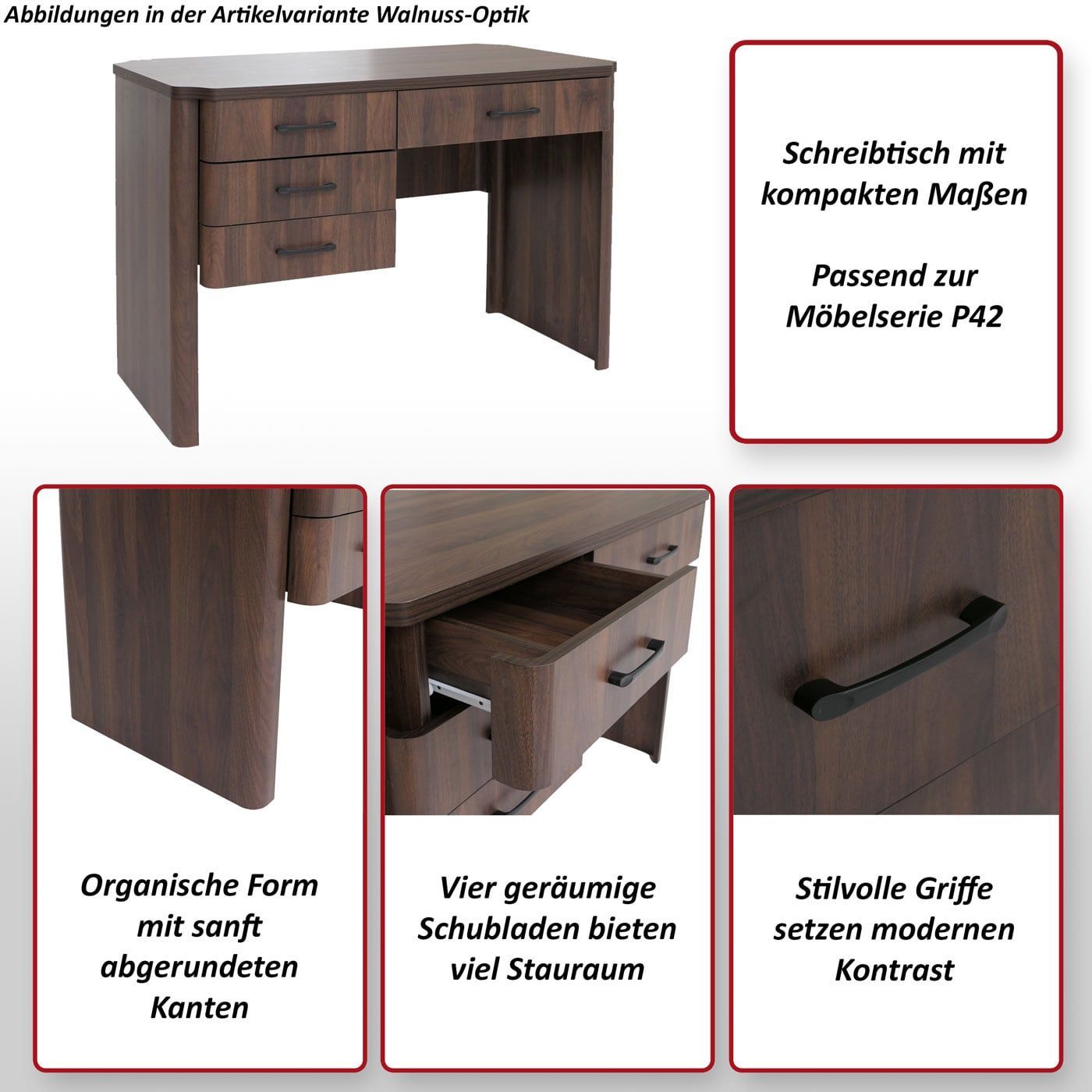 Mendler Schreibtisch HWC-P42, Bürotisch Computertisch, 4 Schubladen MDF 78x110x60cm