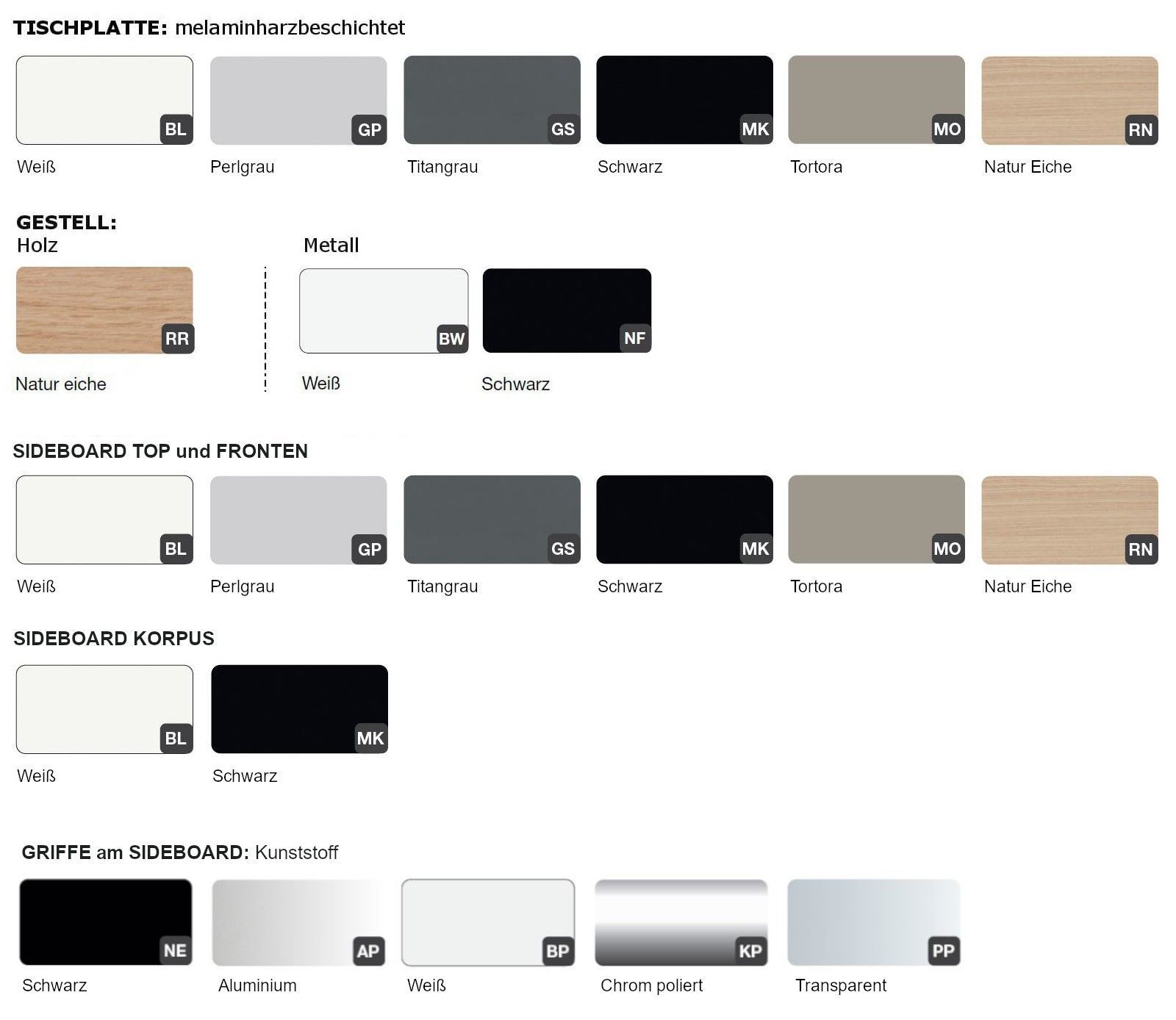 Weiß (BL), Perlgrau (GP), Tortora (MO), Titangrau (GS), Schwarz (MK) und Eiche Natur (RN)