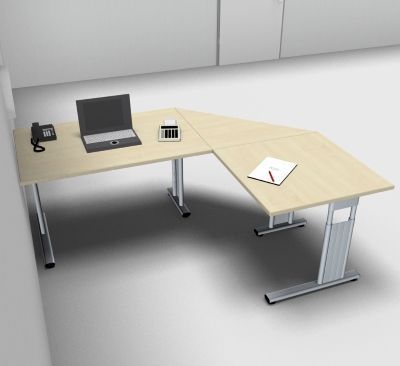 Schreibtischkombination GR1, Stellfläche: 200 x 160 cm (B x T) bestehend aus 1 x Schreibtisch 120 cm (nicht einzeln stellbar), 1 x Eckplatte 90° Dreieck zur Verkettung der Schreitische und 1 x Schreibtisch 80 cm (nicht einzeln stellbar). Dekorfarbe in Ahorn Buche Lichtgrau oder Weiß.