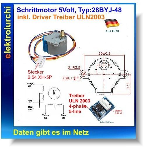Sie bieten hier auf folgenden Artikel 1 Stück Schrittmotor 28BYJ-48 inkl. Treiber für Arduino ULN2003 4-Phasen-5-Line Diese Schrittmotor-Treiber-Platine ULN2003 ist für Arduino entwickelt worden. Sehr einfach zu installieren Über 4 LEDs kann man die Ansteuerung auch optisch kontrollieren. Beschreibu