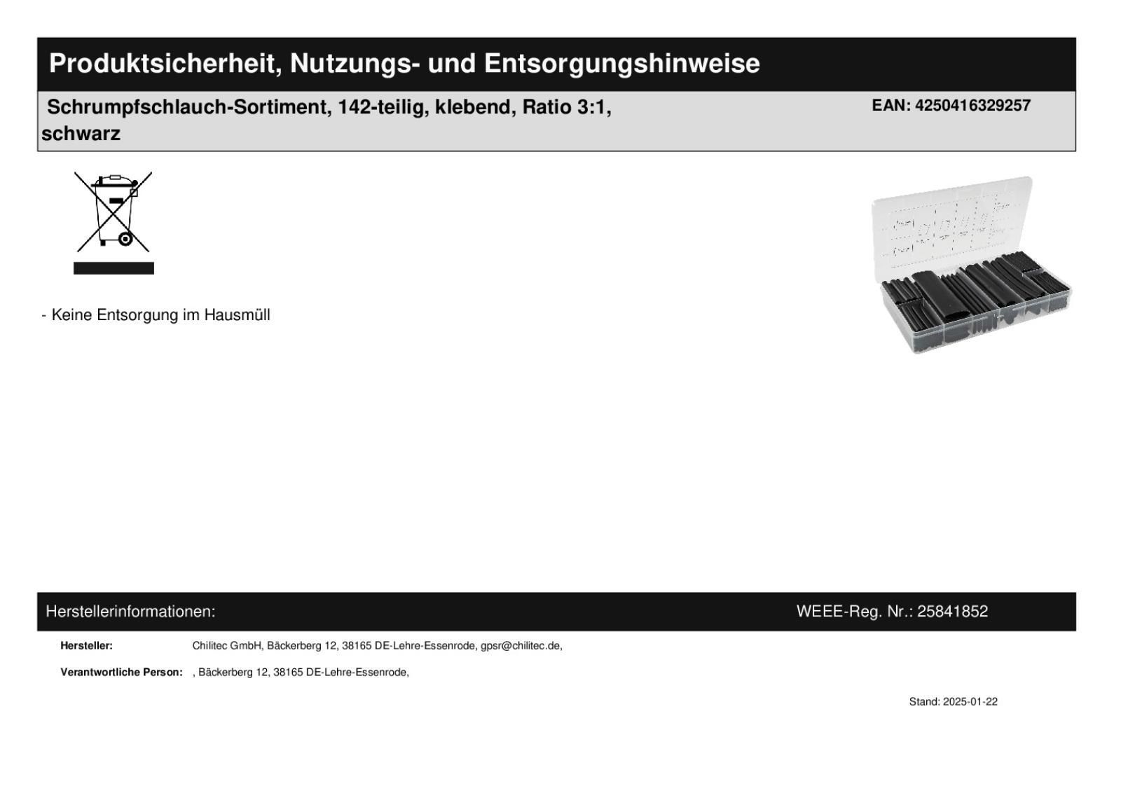 ChiliTec Schrumpfschlauch Sortiment 142-teilig, klebend, Schrumpfrate Ratio 3:1, schwarz