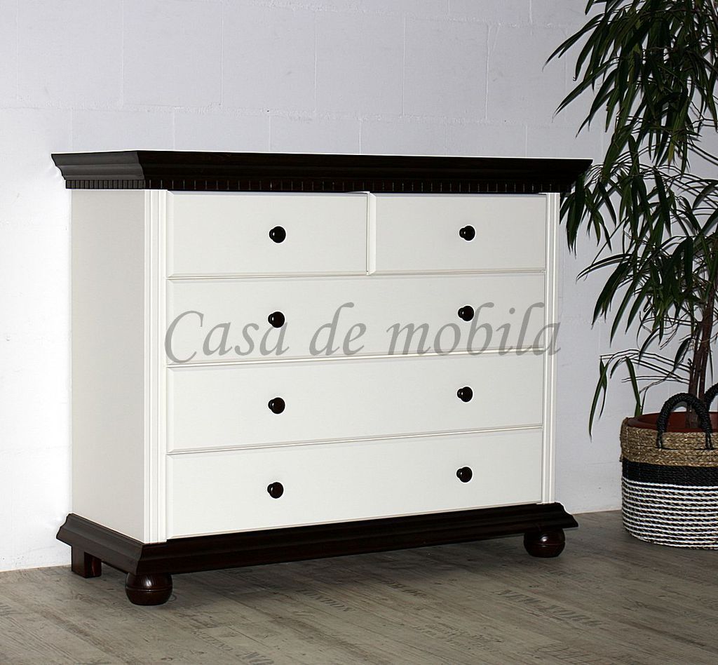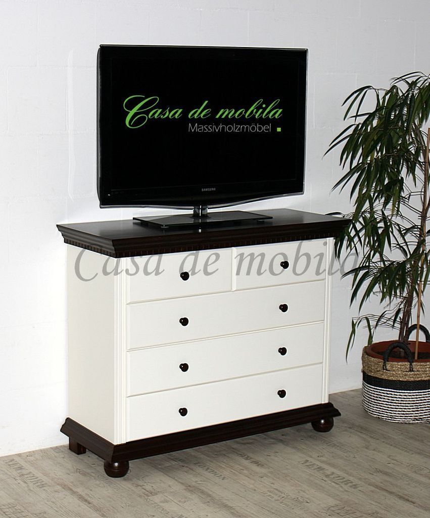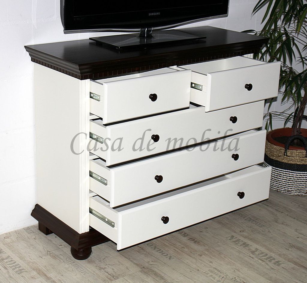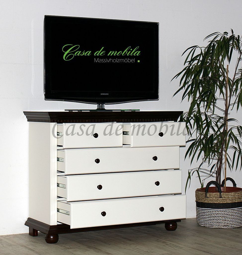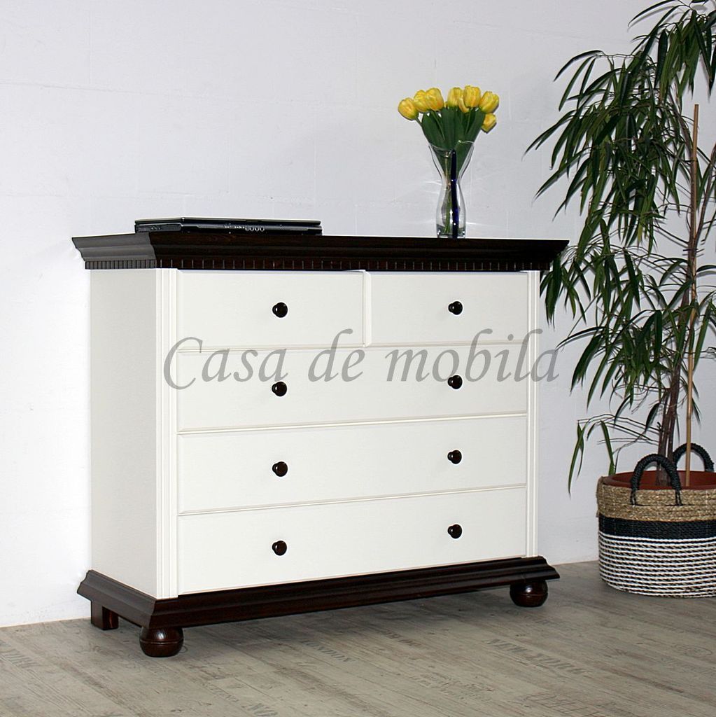 innerhalb 10 Tagen - Artikelbeschreibung: 3 breite Schubladen 2 schmale Schubladen Holz: Fichte massiv Oberfläche: Korpus altweiß lackiert Kranz Boden Füße kolonialfarben lackiert Maße ca.: Breite 114 cm Höhe 92 cm Tiefe 45 cm Lieferzustand: zerlegt zur Selbstmontage