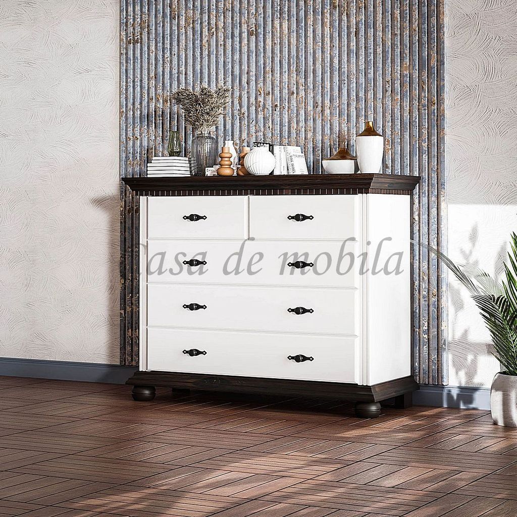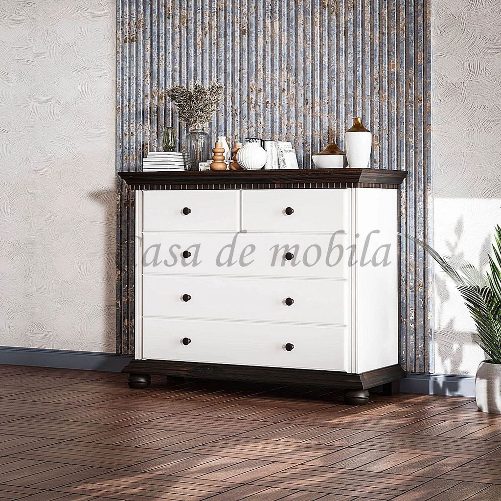 Artikelbeschreibung:3 breite Schubladen2 schmale SchubladenHolz: Fichte massivOberfläche:Korpus altweiß lackiertKranz/Boden/Füße kolonialfarben lackiertMaße ca.:Breite 114 cmHöhe 92 cmTiefe 45 cmLieferzustand: zerlegt zur Selbstmontage