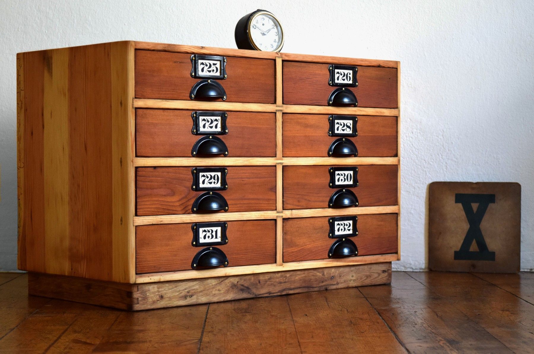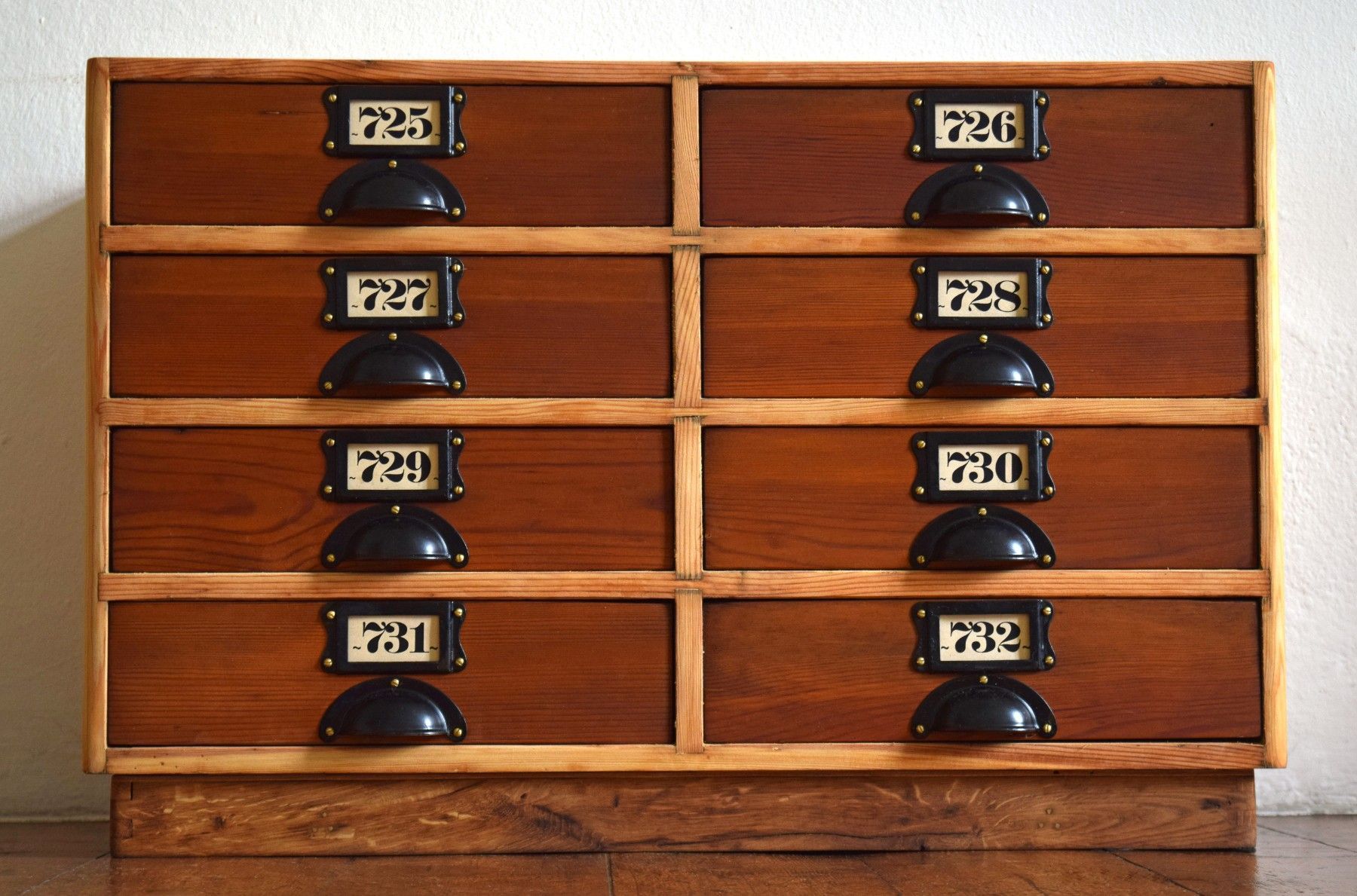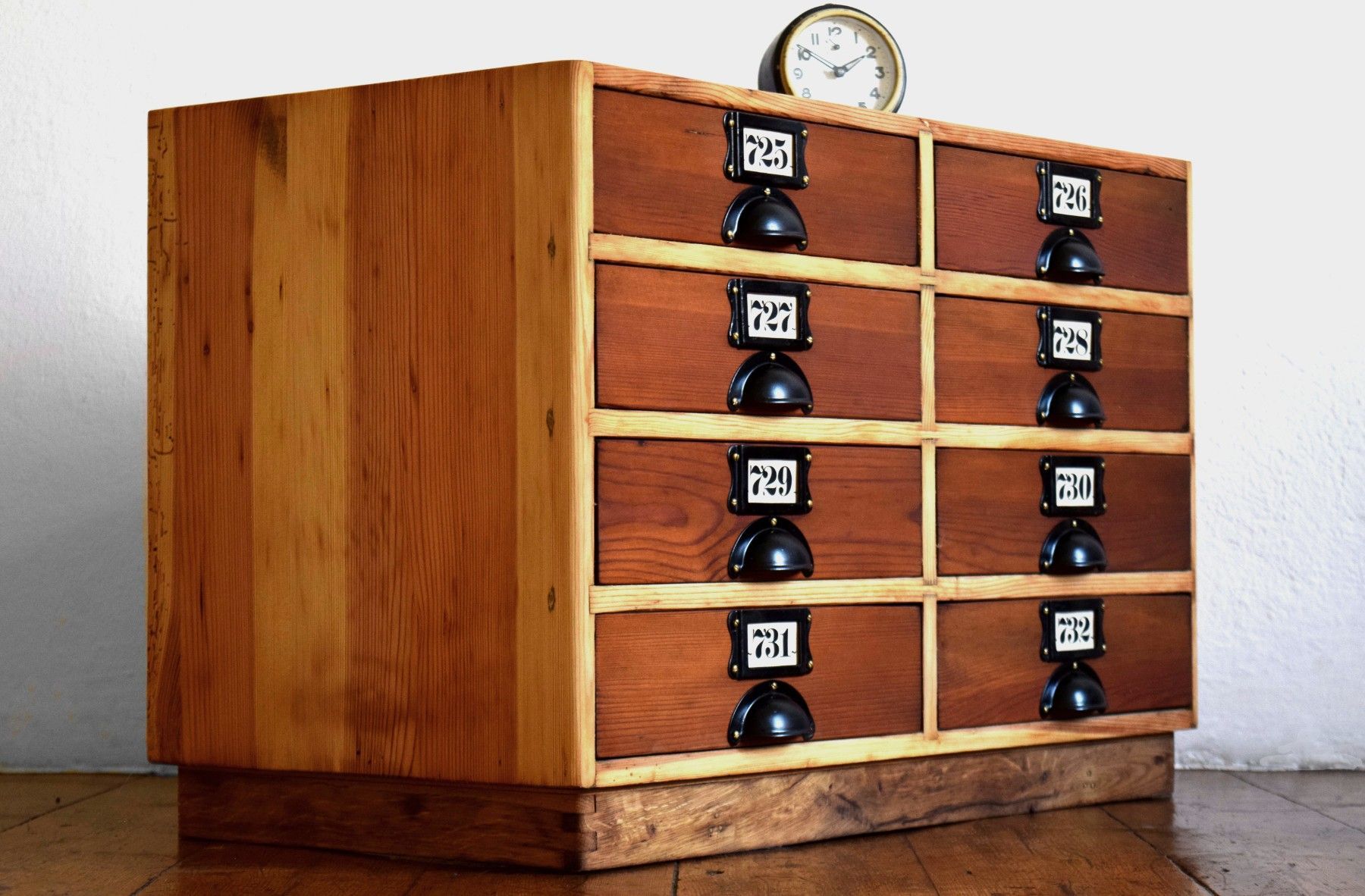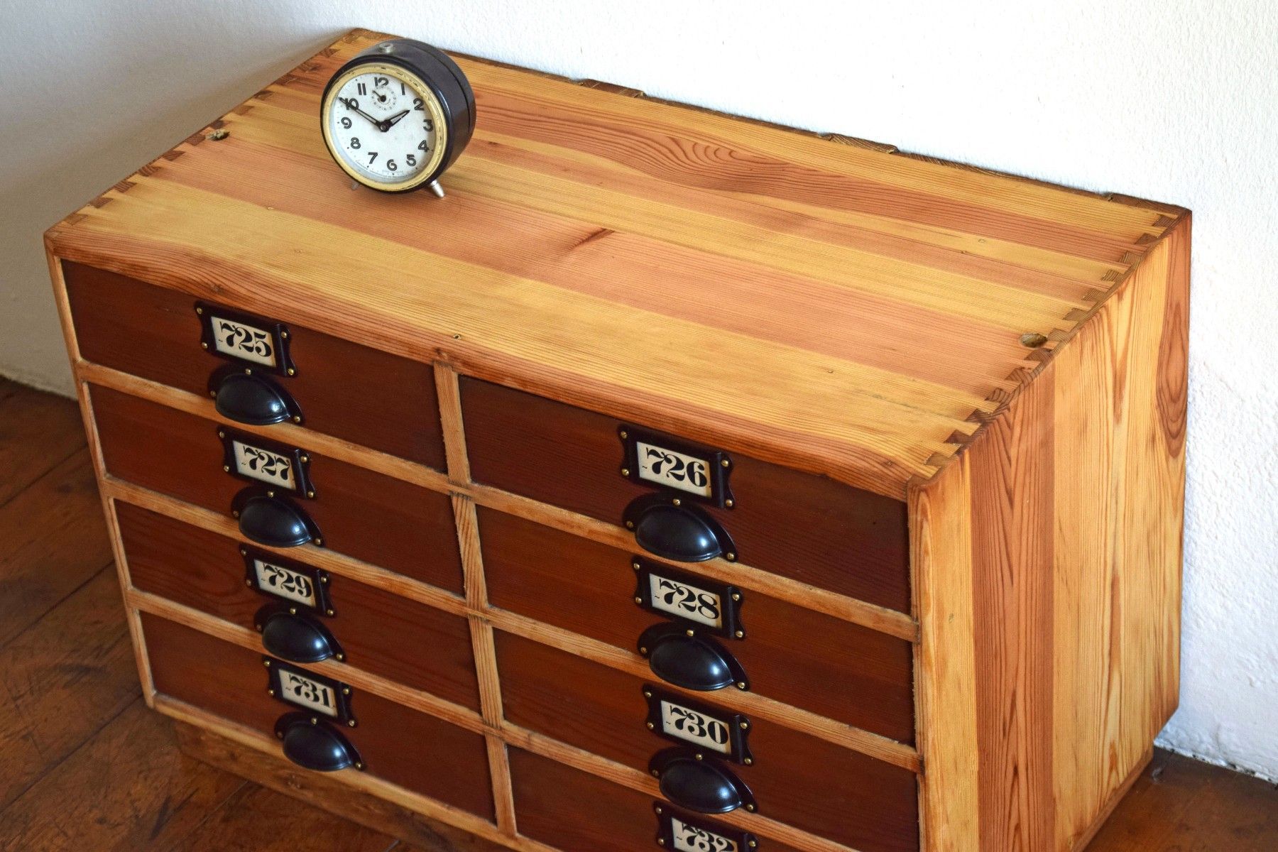 klassischer antiker Schubladenschrank (um 1935) aus Vollholz, Beschriftungsfelder und Muschelgriffe aus schwarzem Metall Höhe 45cm, Breite 68cm, Tiefe 35cm acht Schubladen, nutzbares Innenmaß: 6,5 x 29 x 31cm mit Gebrauchsspuren, guter Zustand, gepflegt, sauber und wohnfertig auch als Sortierschrank verwendbar