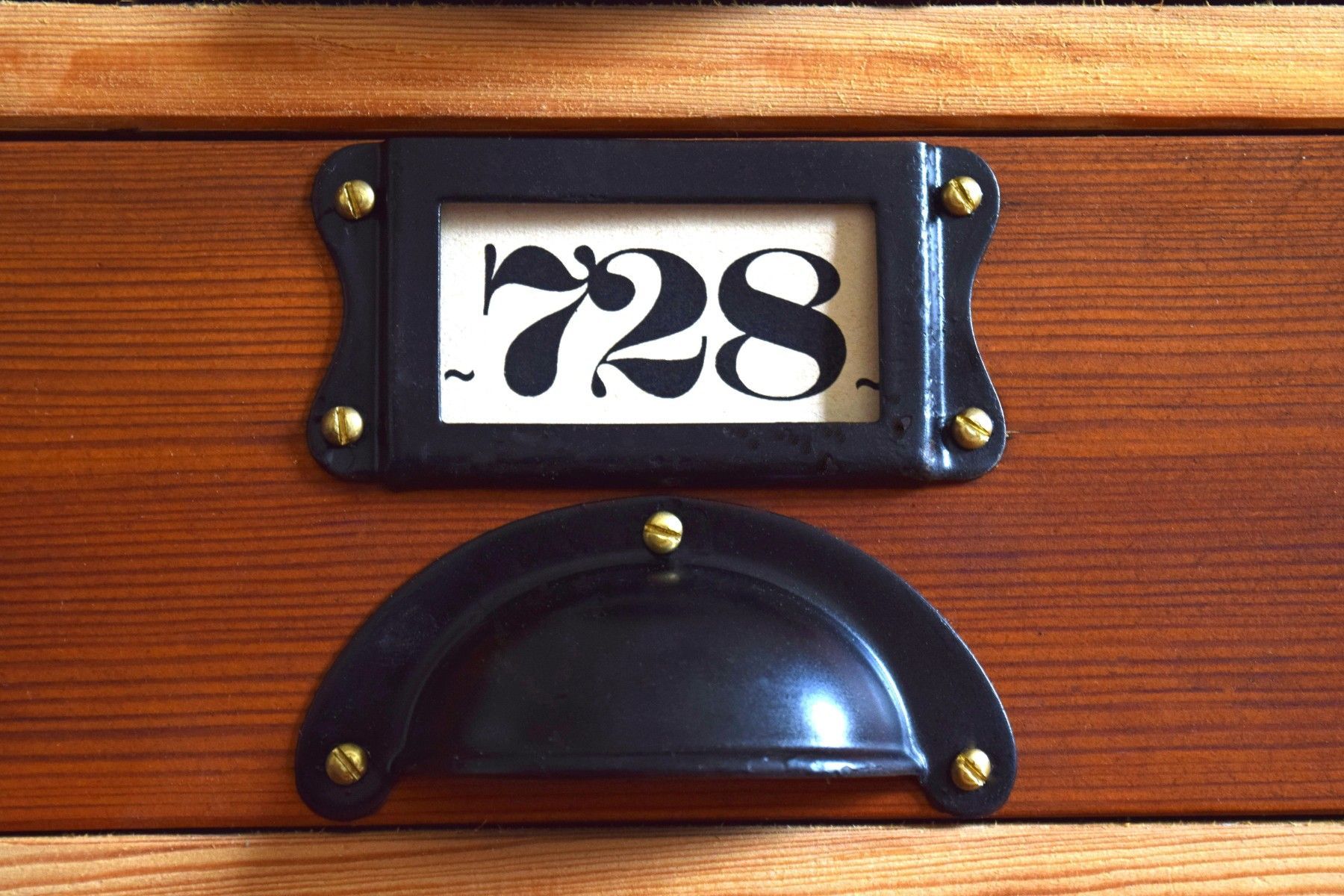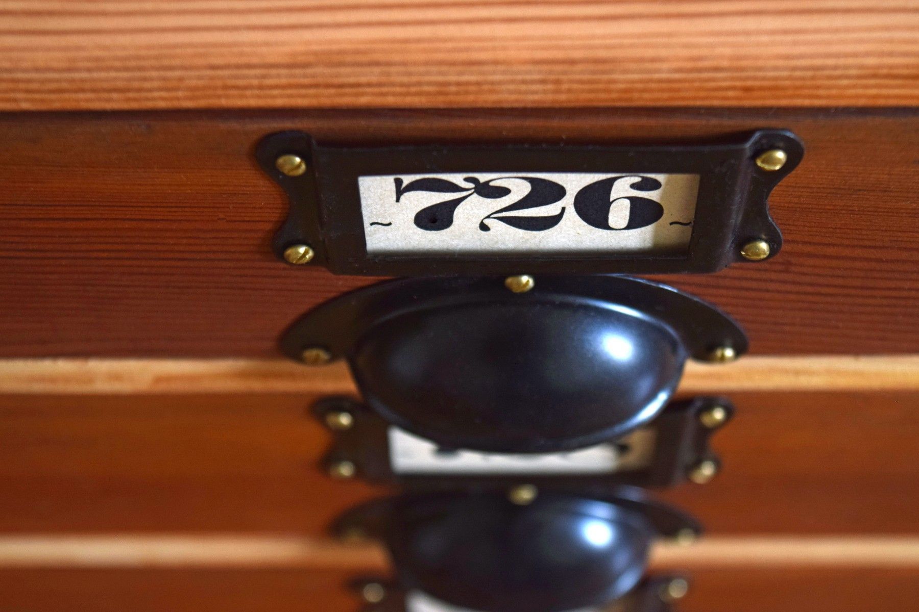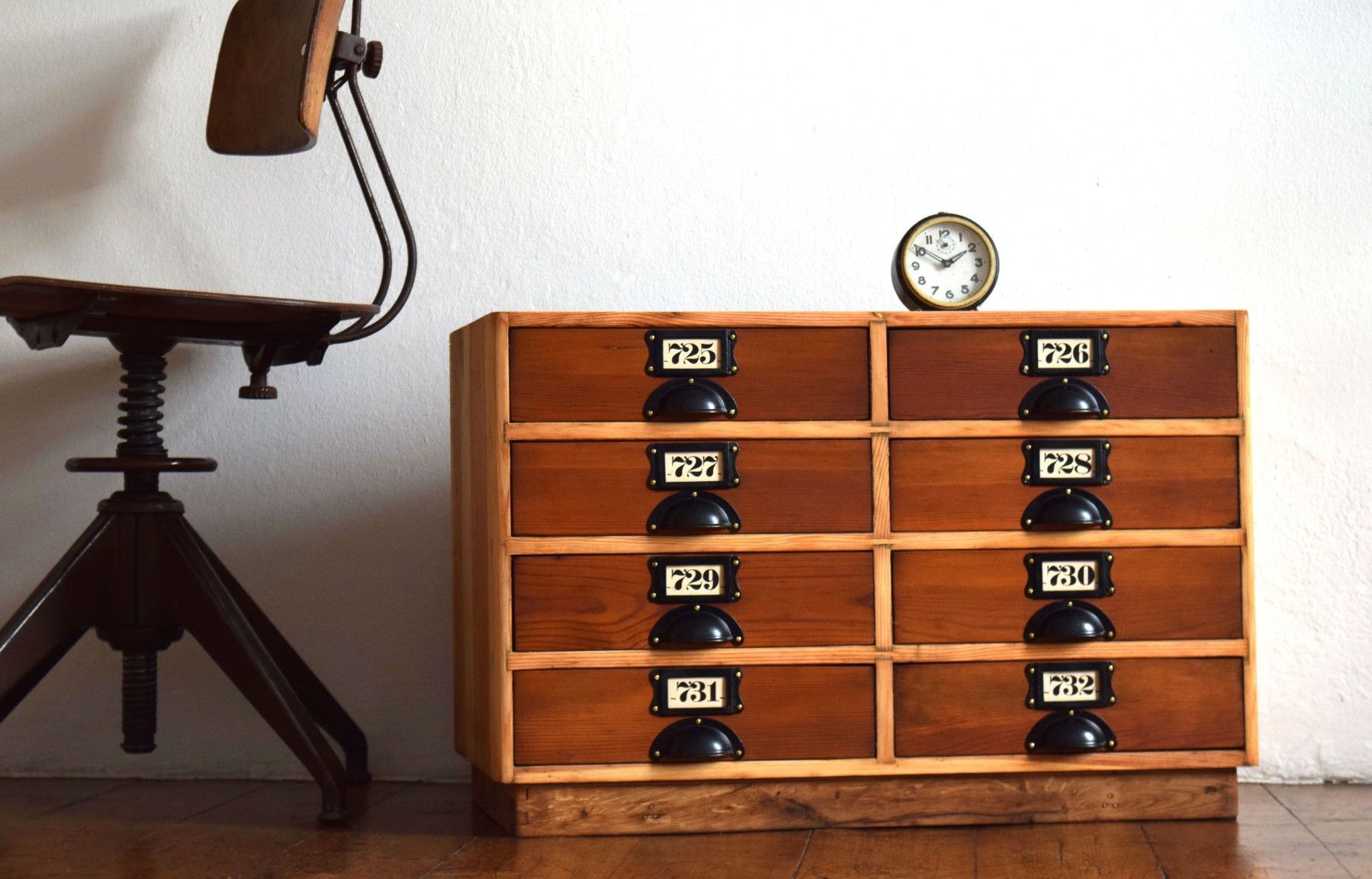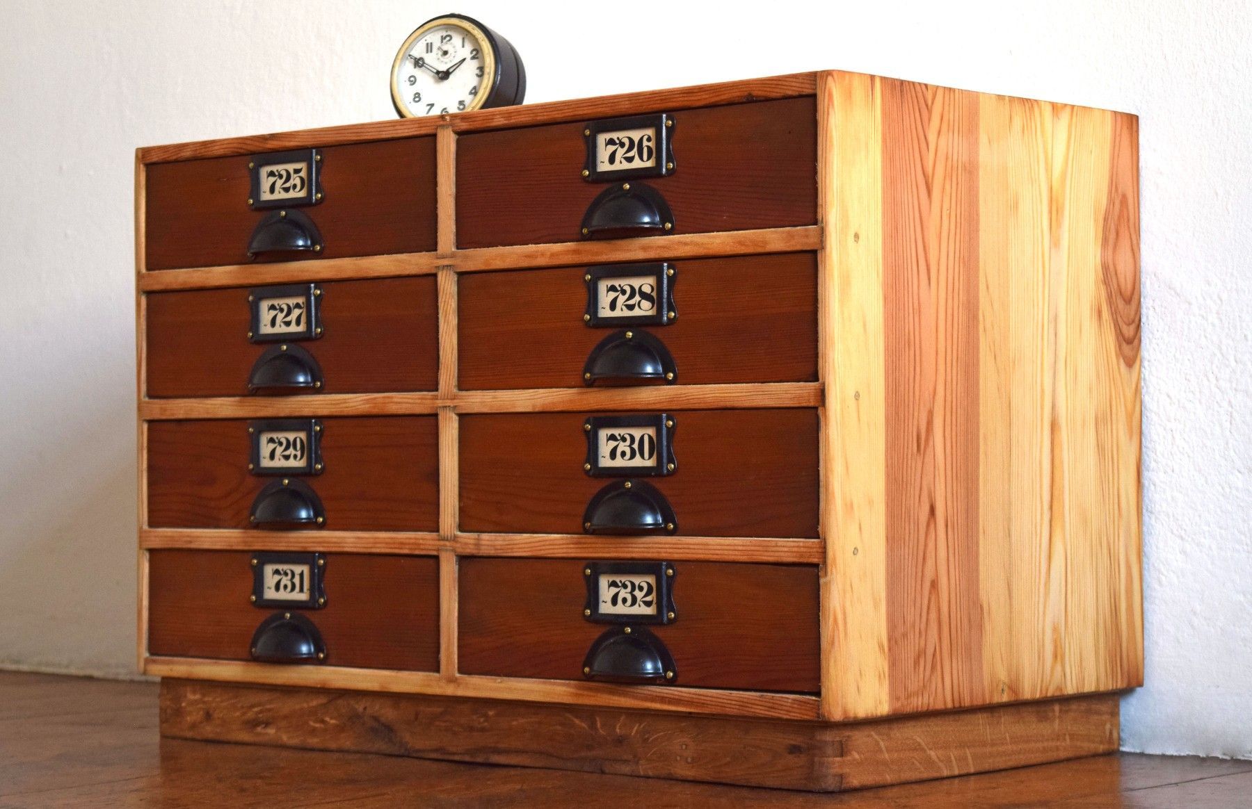 klassischer antiker Schubladenschrank (um 1935) aus Vollholz, Beschriftungsfelder und Muschelgriffe aus schwarzem Metall Höhe 45cm, Breite 68cm, Tiefe 35cm acht Schubladen, nutzbares Innenmaß: 6,5 x 29 x 31cm mit Gebrauchsspuren, guter Zustand, gepflegt, sauber und wohnfertig auch als Sortierschrank verwendbar
