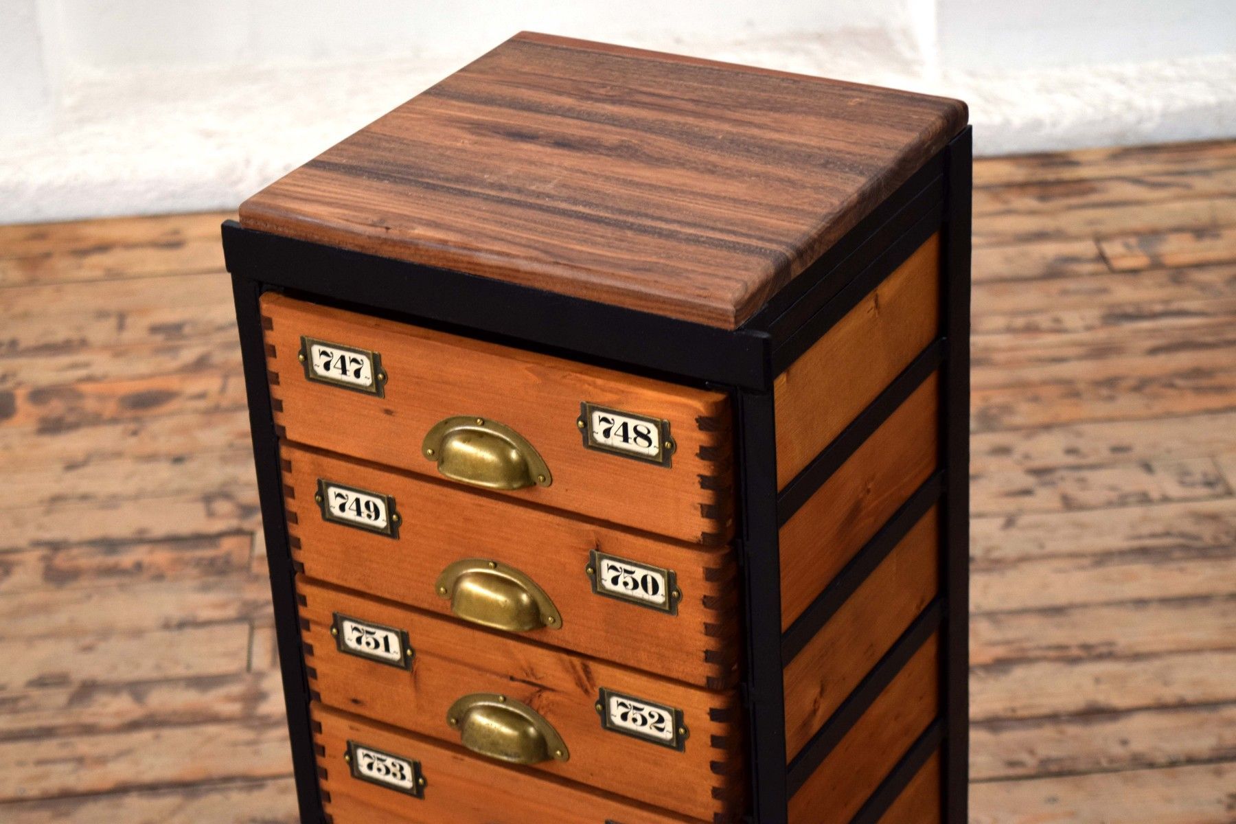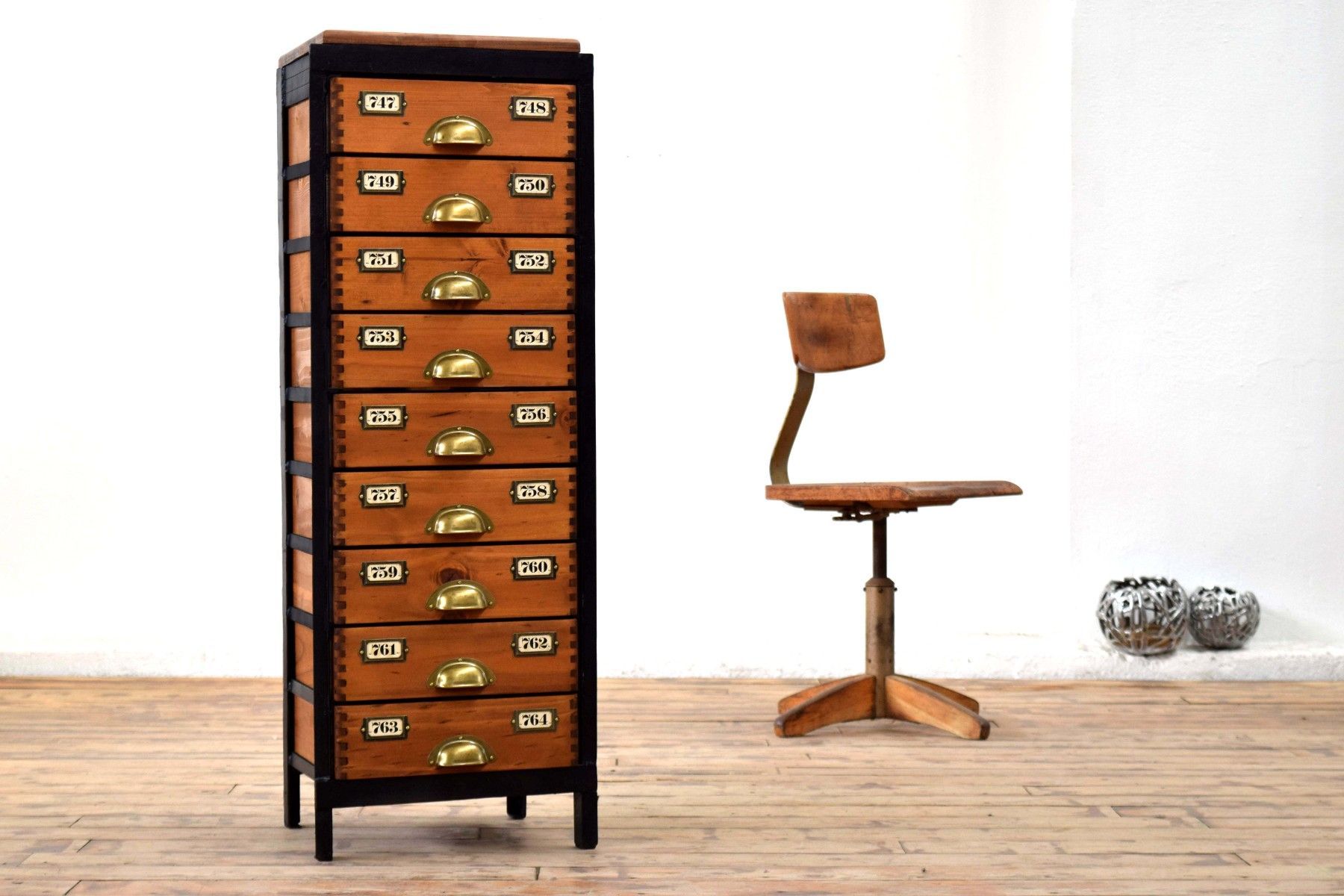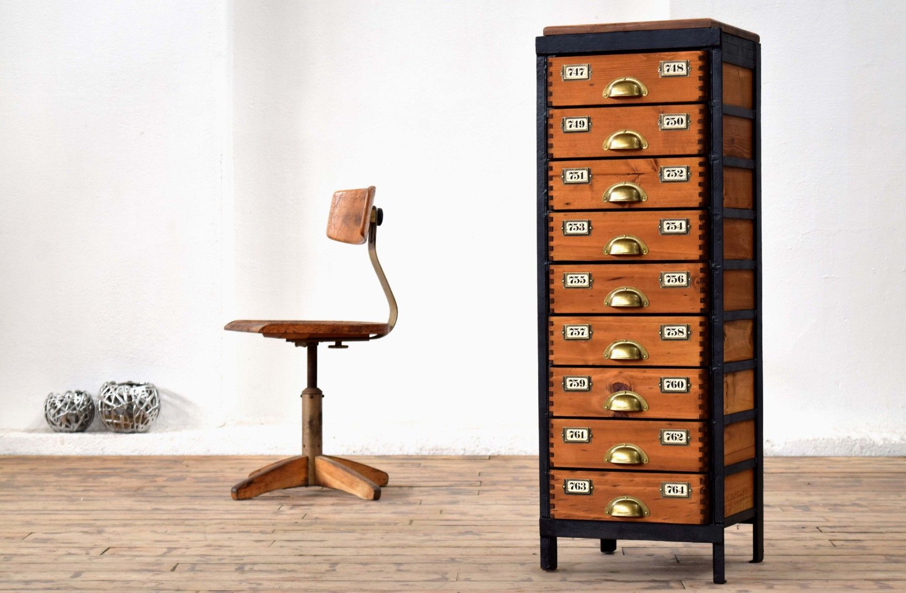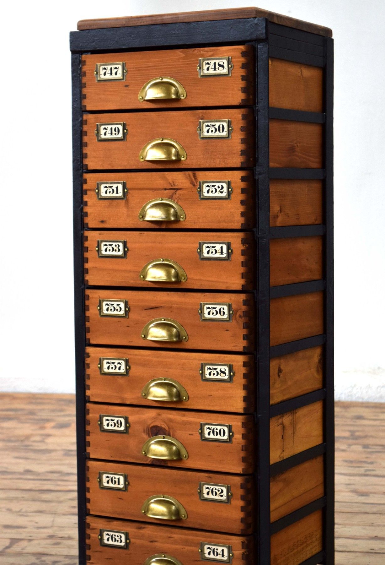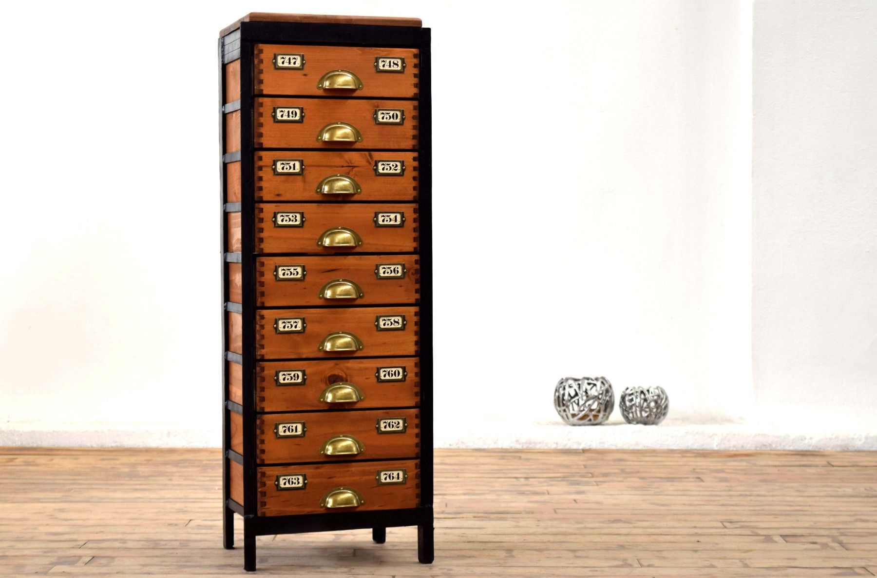 Schubladenschrank Bauhaus Loft Antik Apothekerschrank Holz Alt Metall schmal hoch