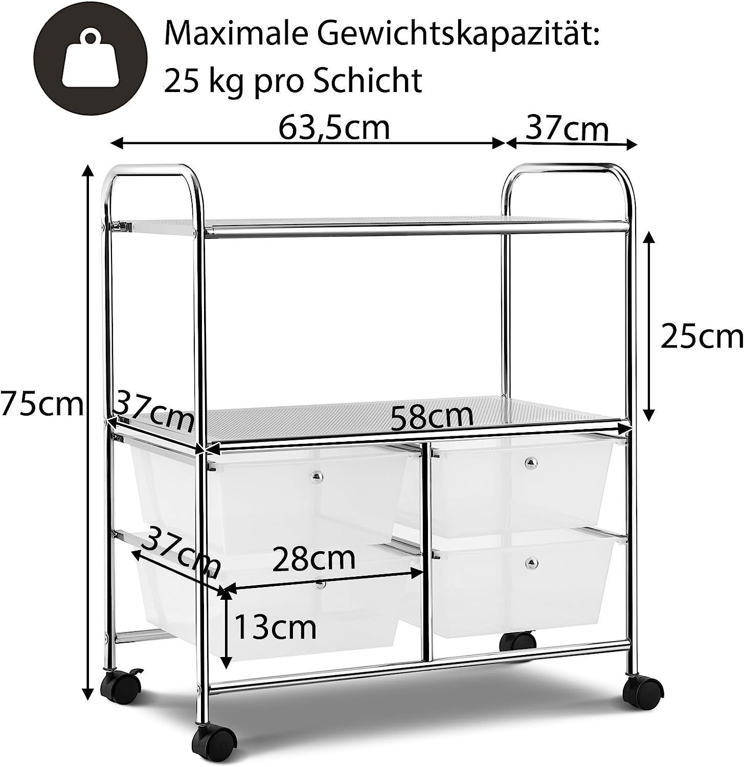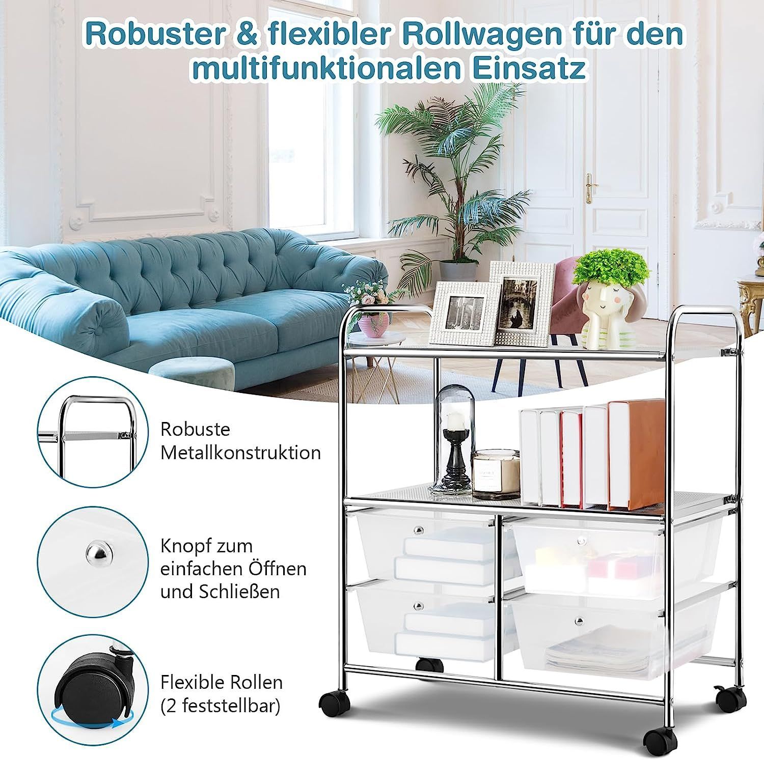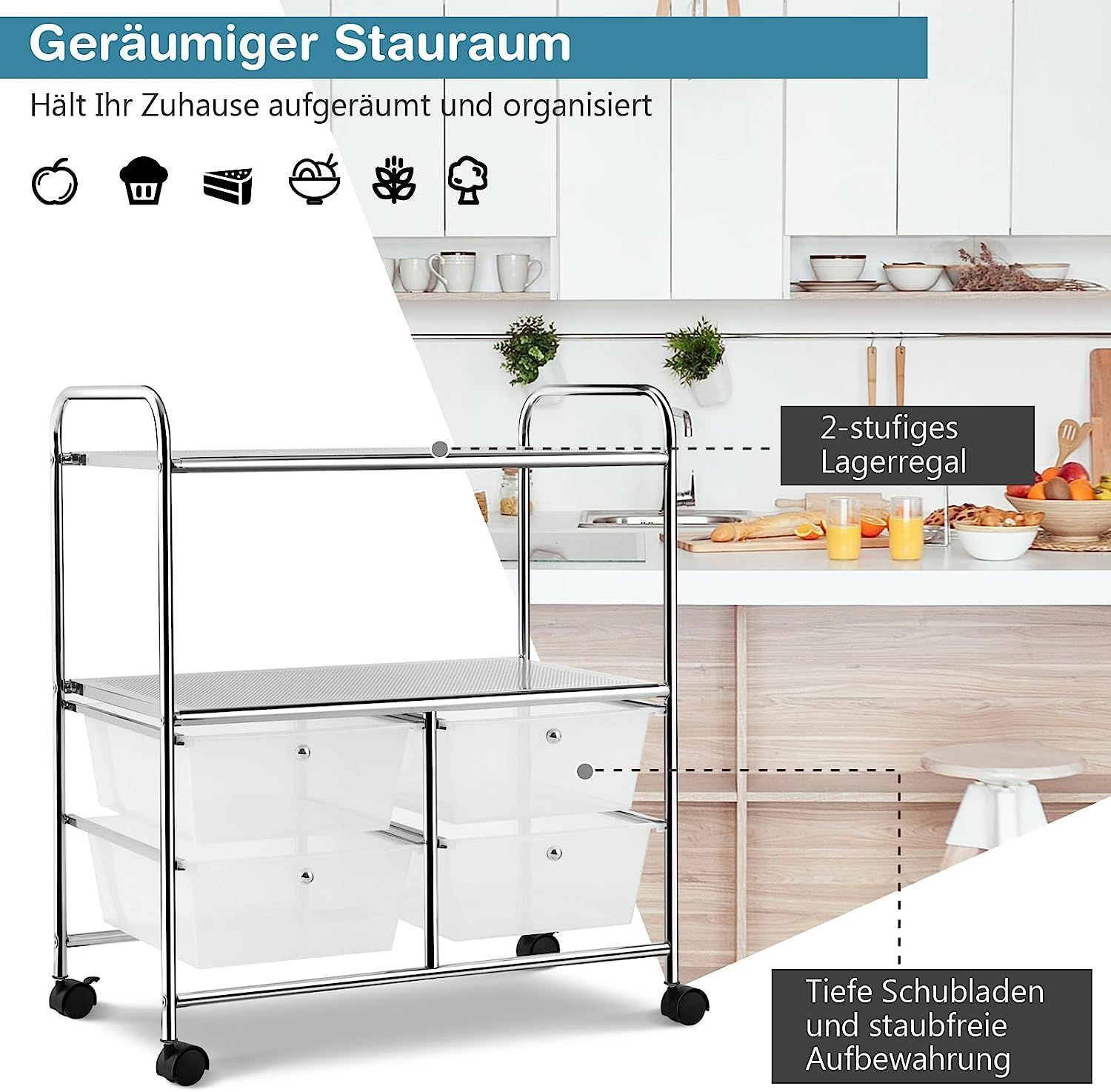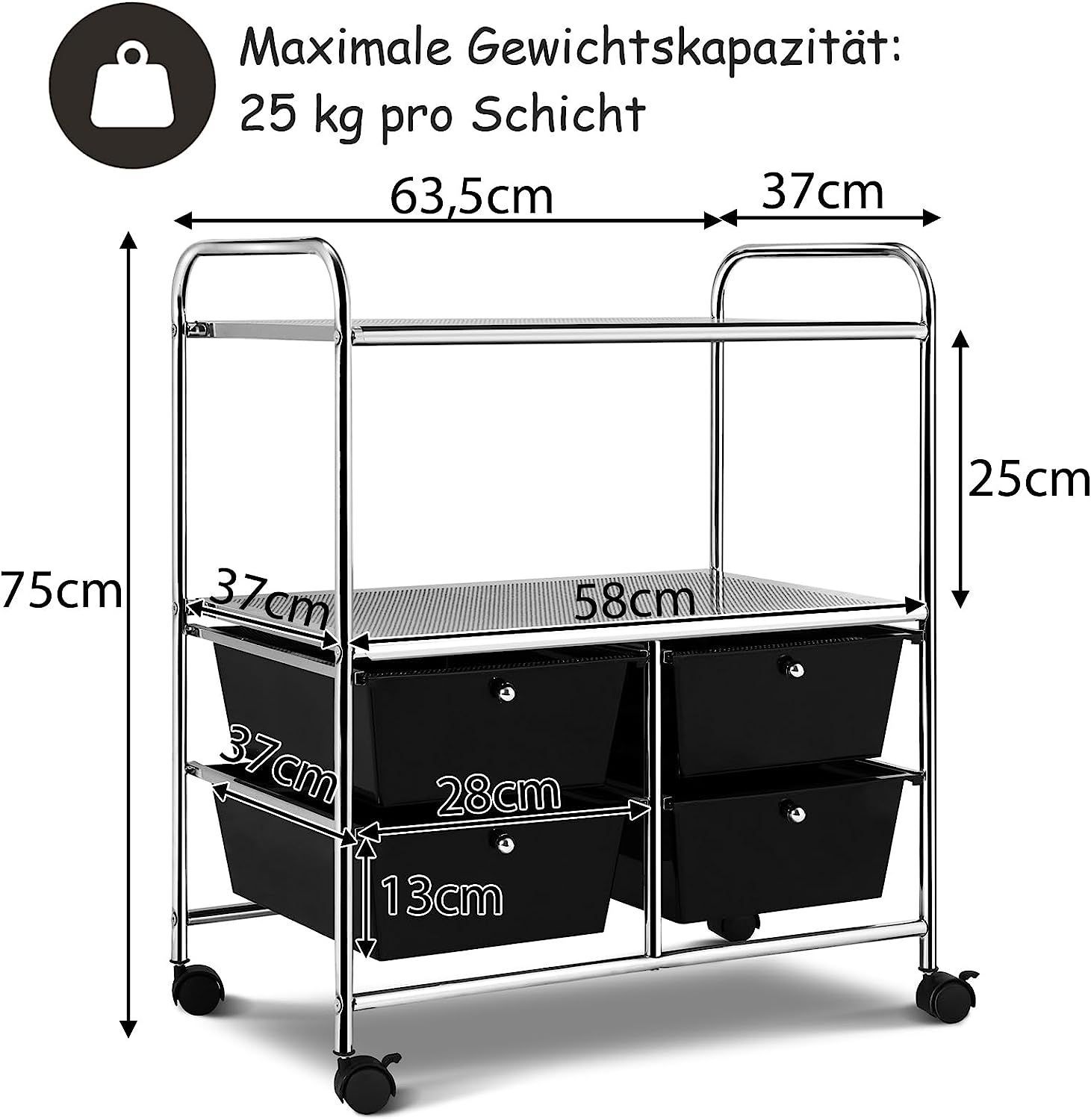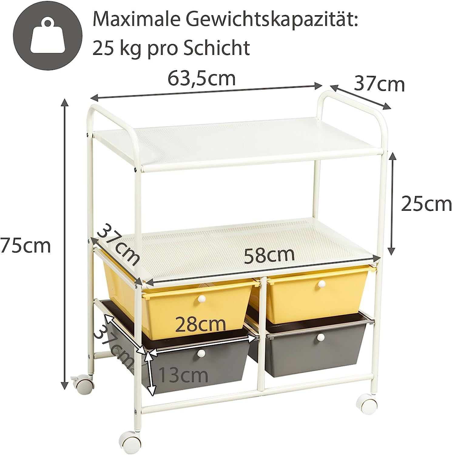 Schubladenwagen Rollcontainer mit Metallgestell und Ablageflächen, Rollwagen für Büro
