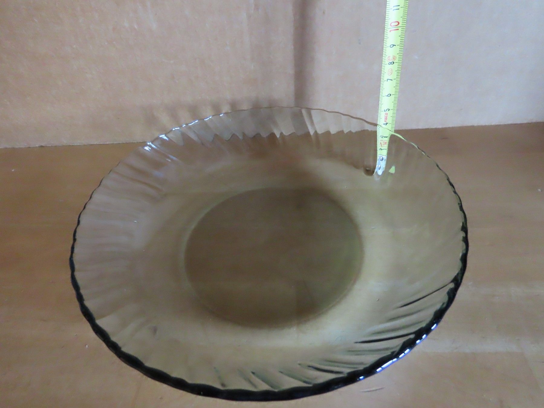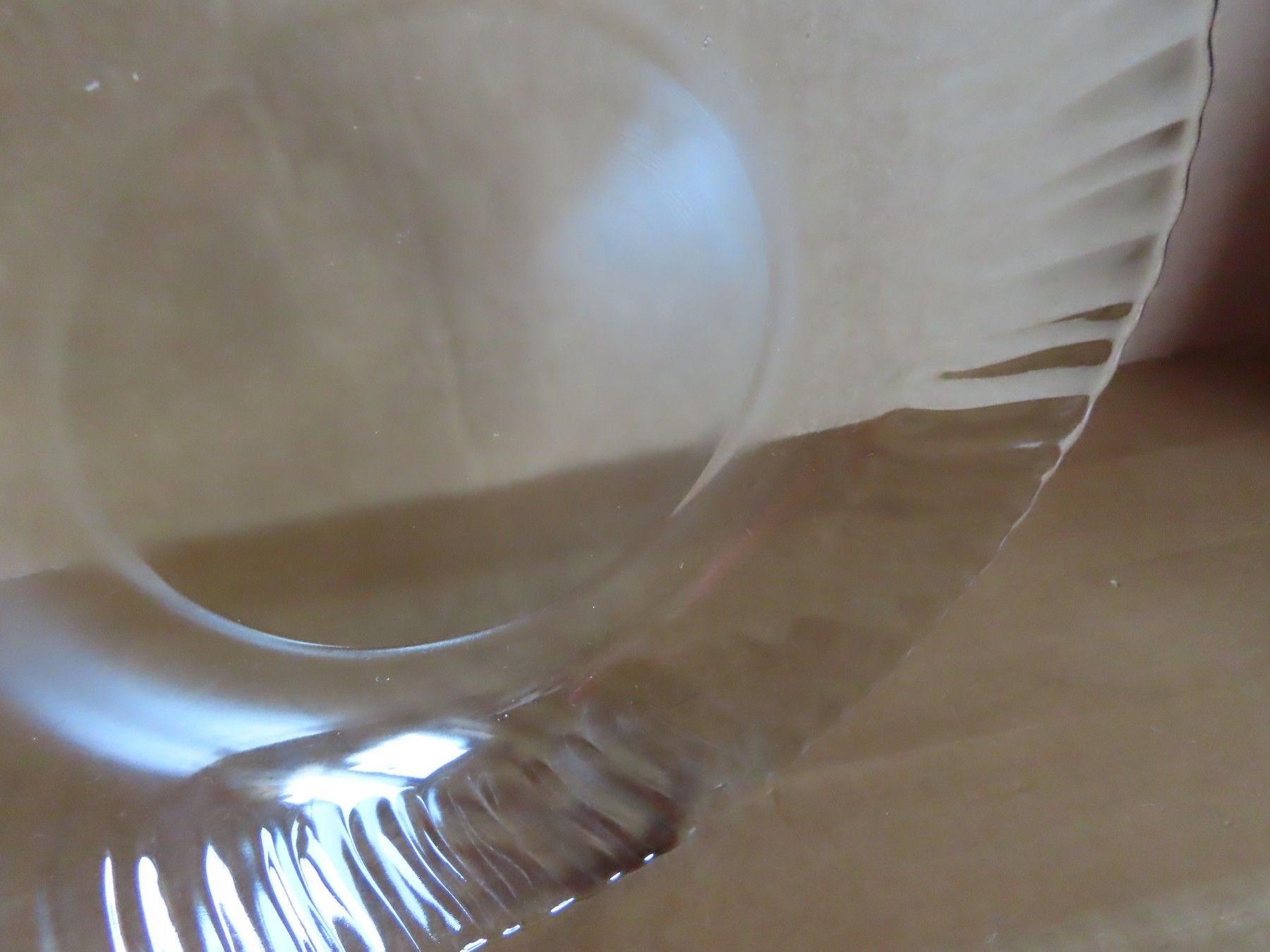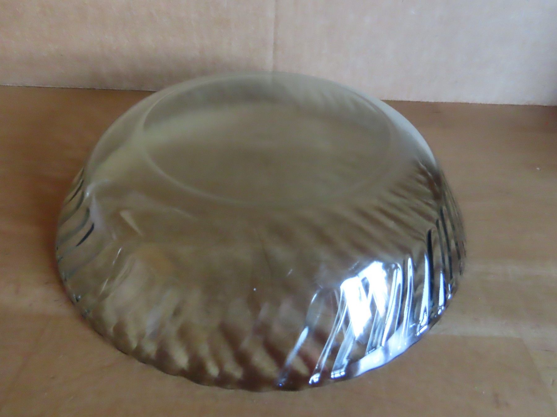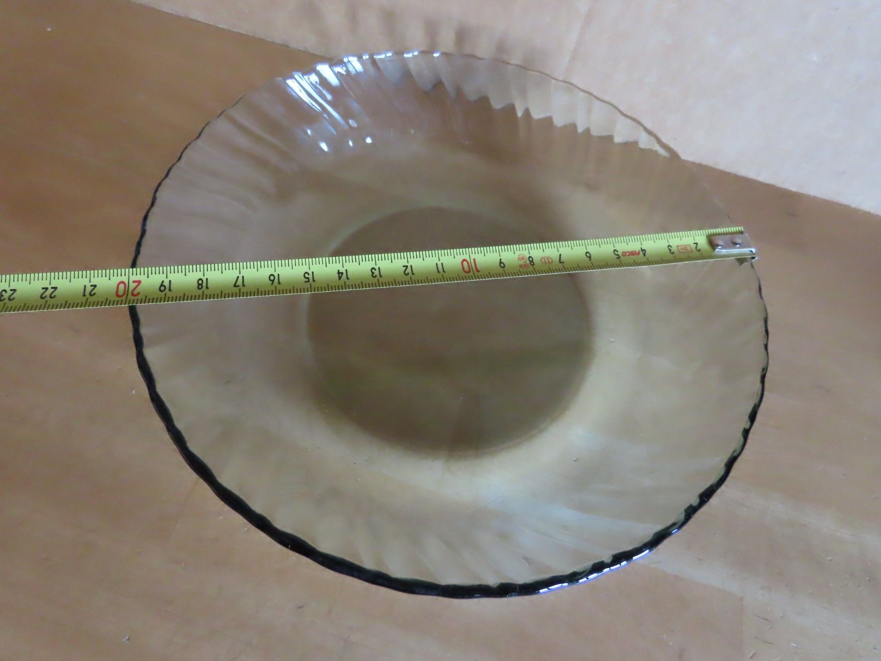 Maße ca. 4,3 cm hoch x ca. 20 cm Durchmesser--immer die breiteste Stelle gemessen Boden hat einen Durchmesser von ca. 11 cm Material: Glas ist verschmutzt verstaubt,hat feine Kratzer