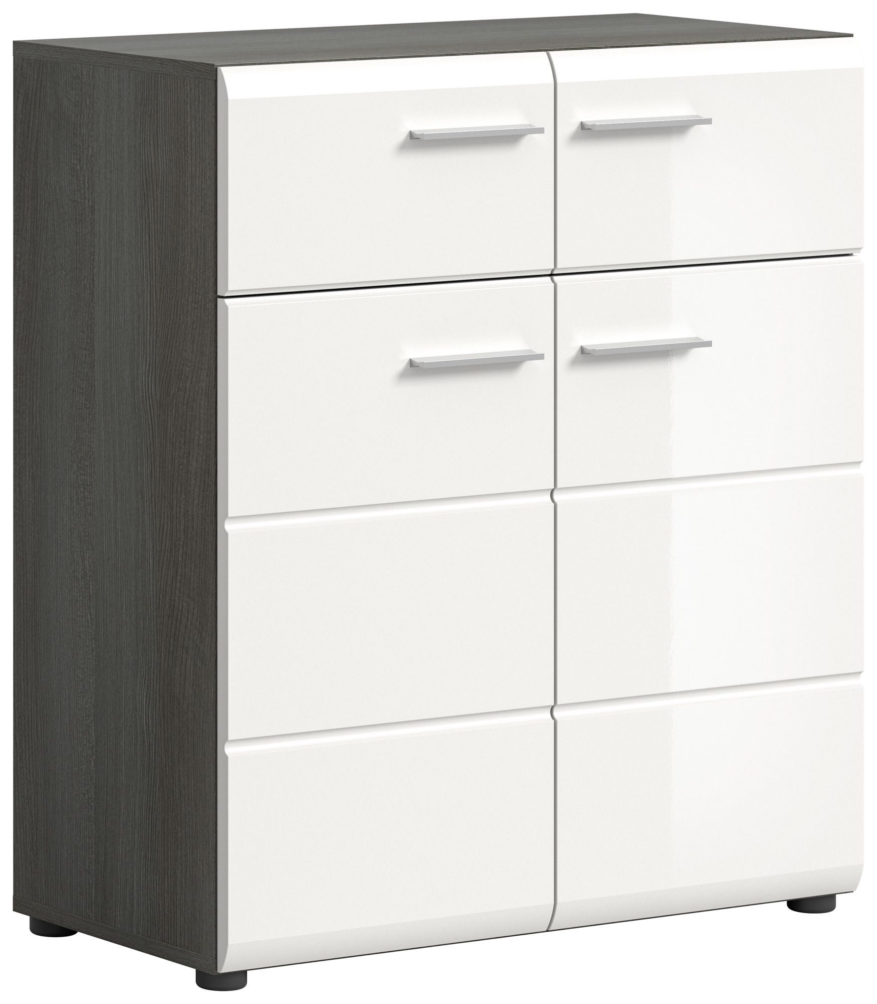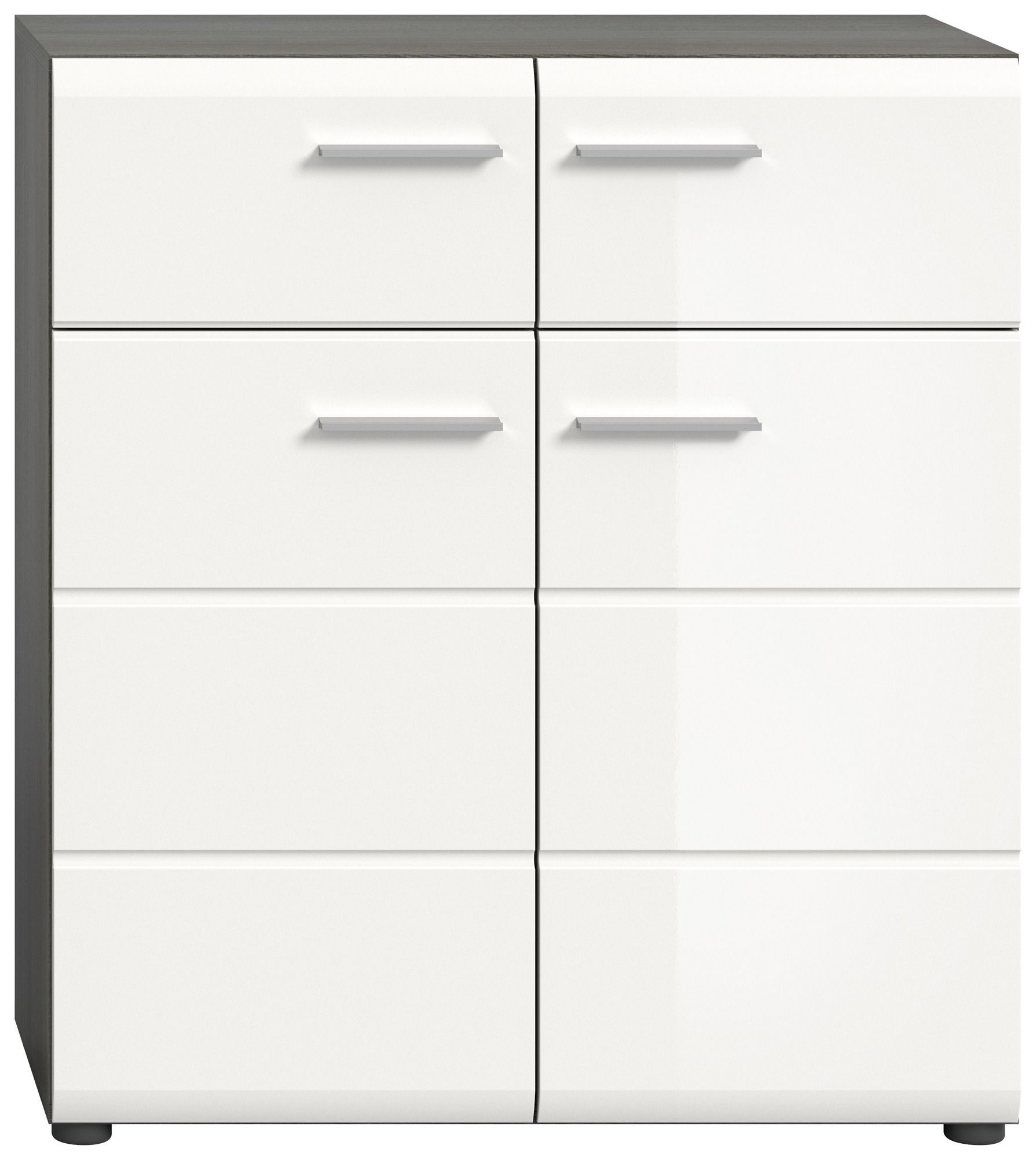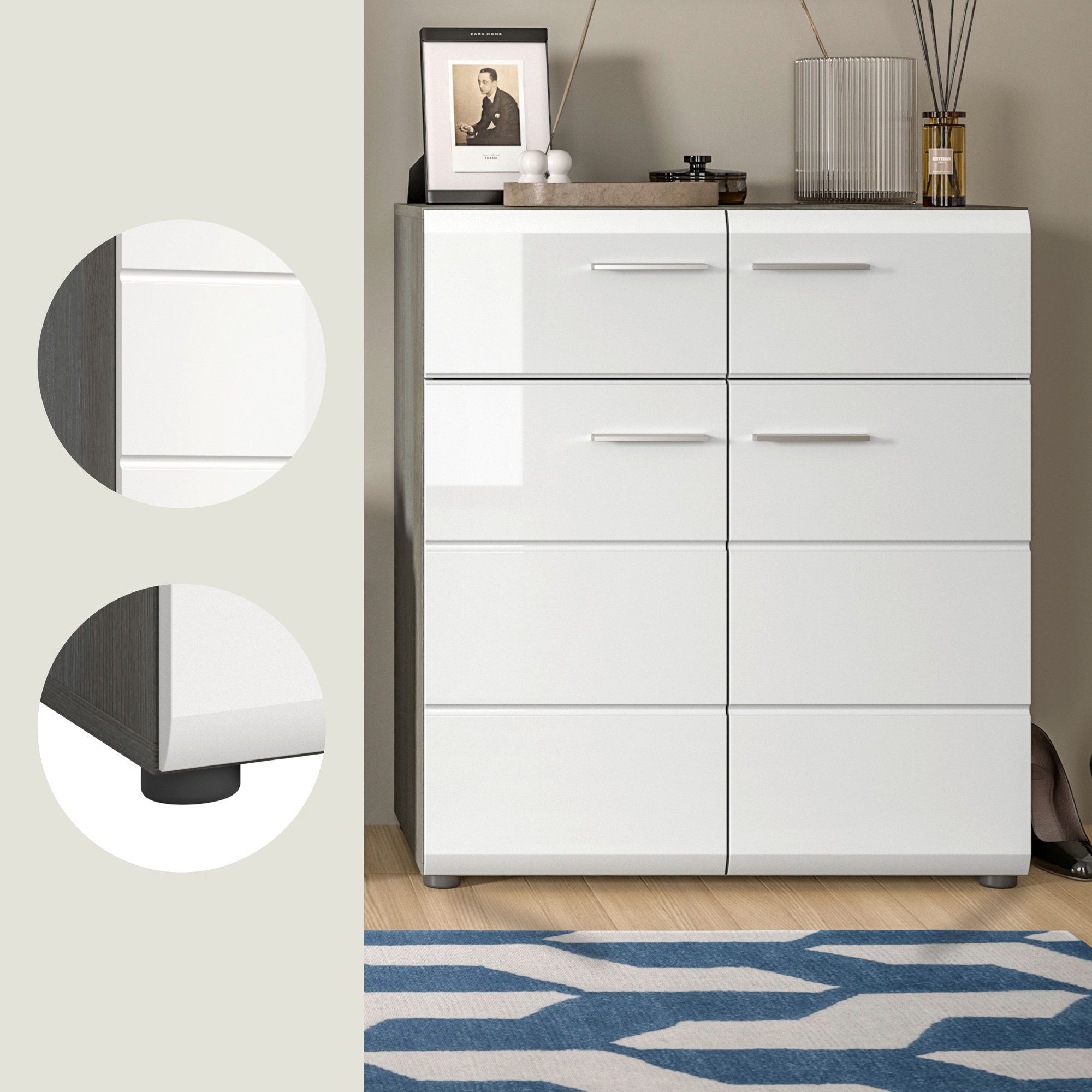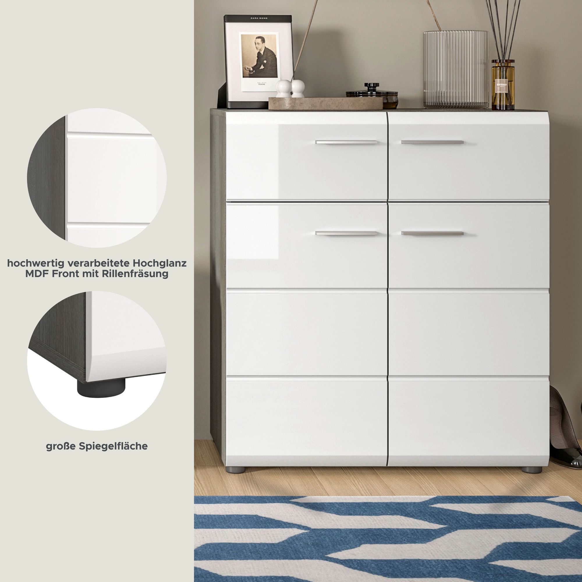 Schuhkommode in Rauchsilber Nachbildung und weiß Hochglanz tiefzieh