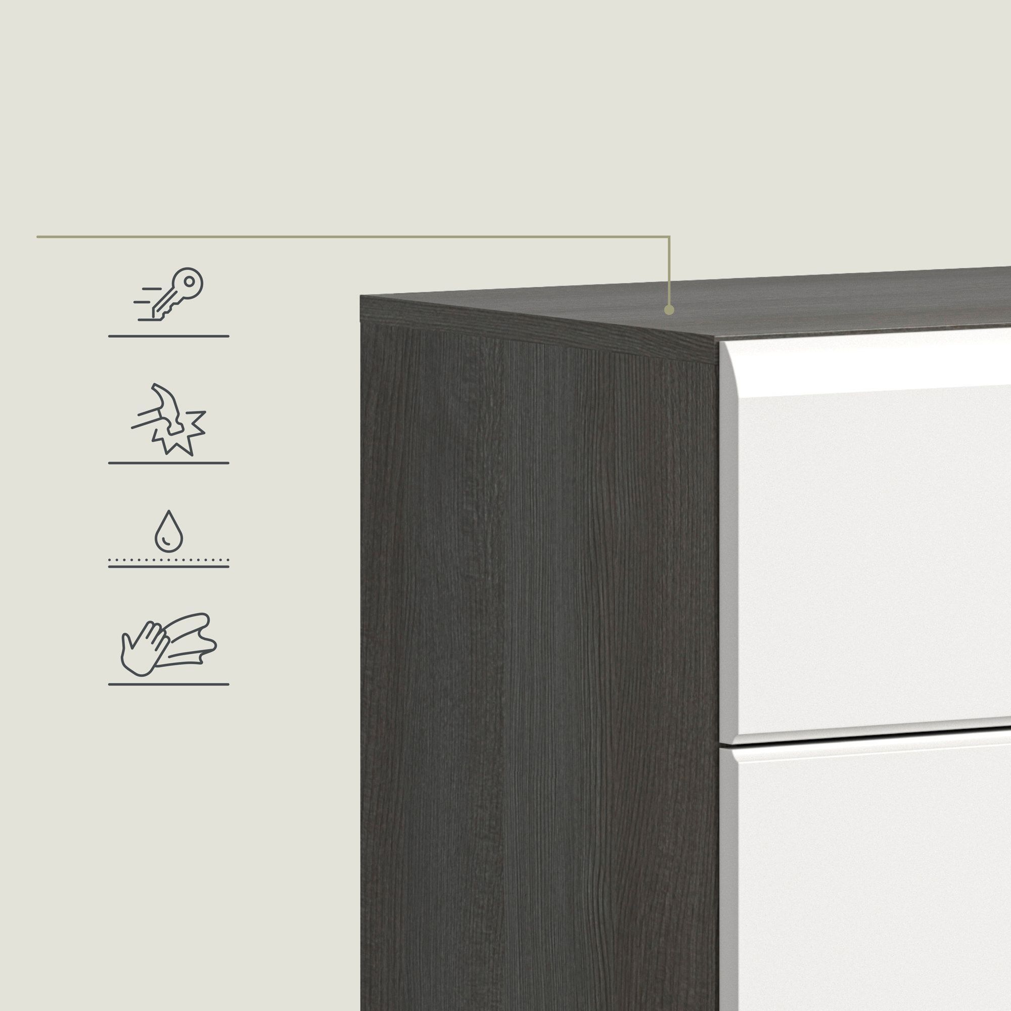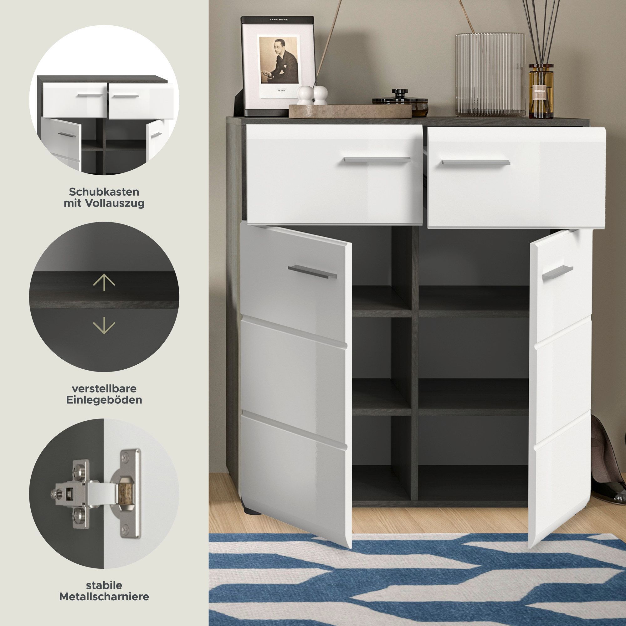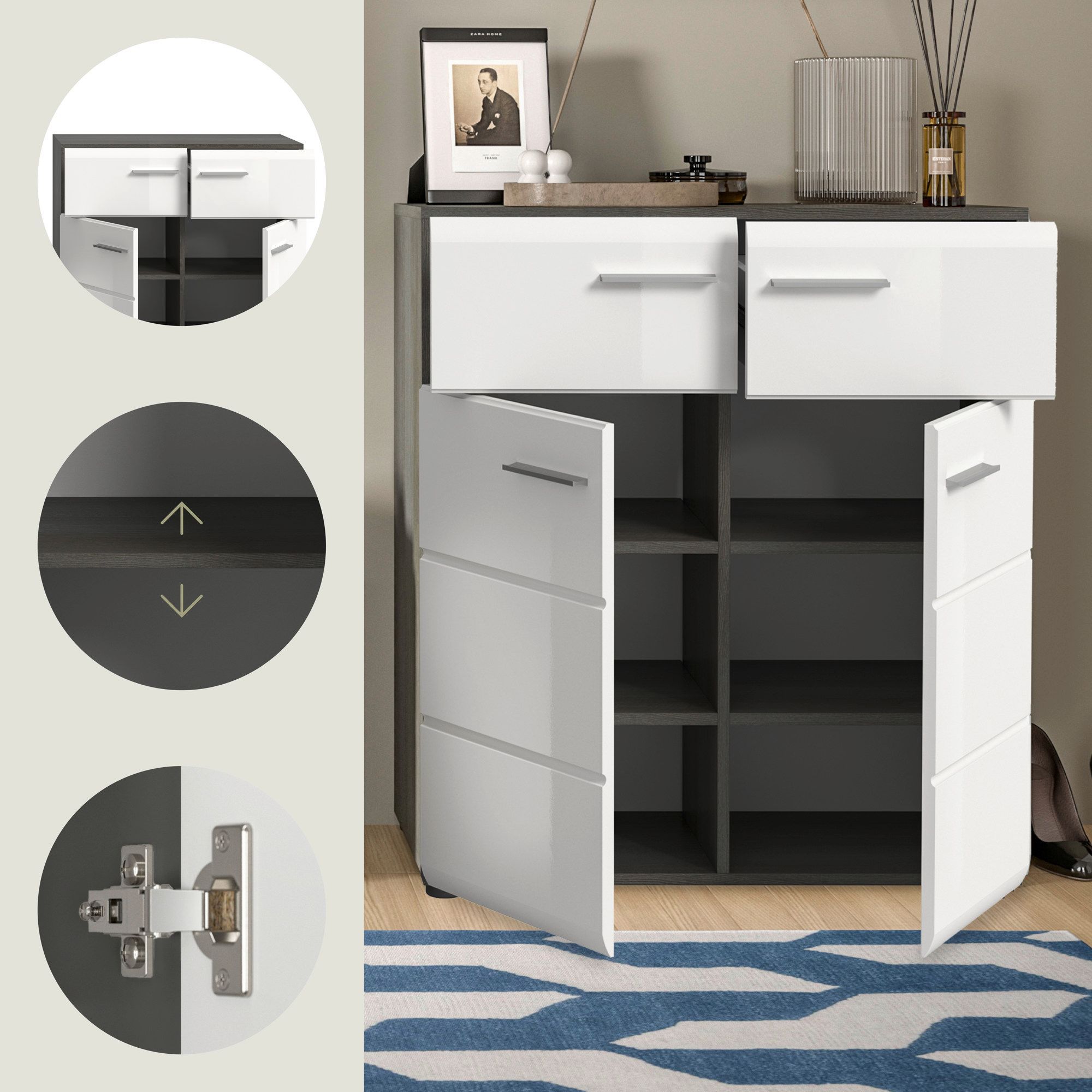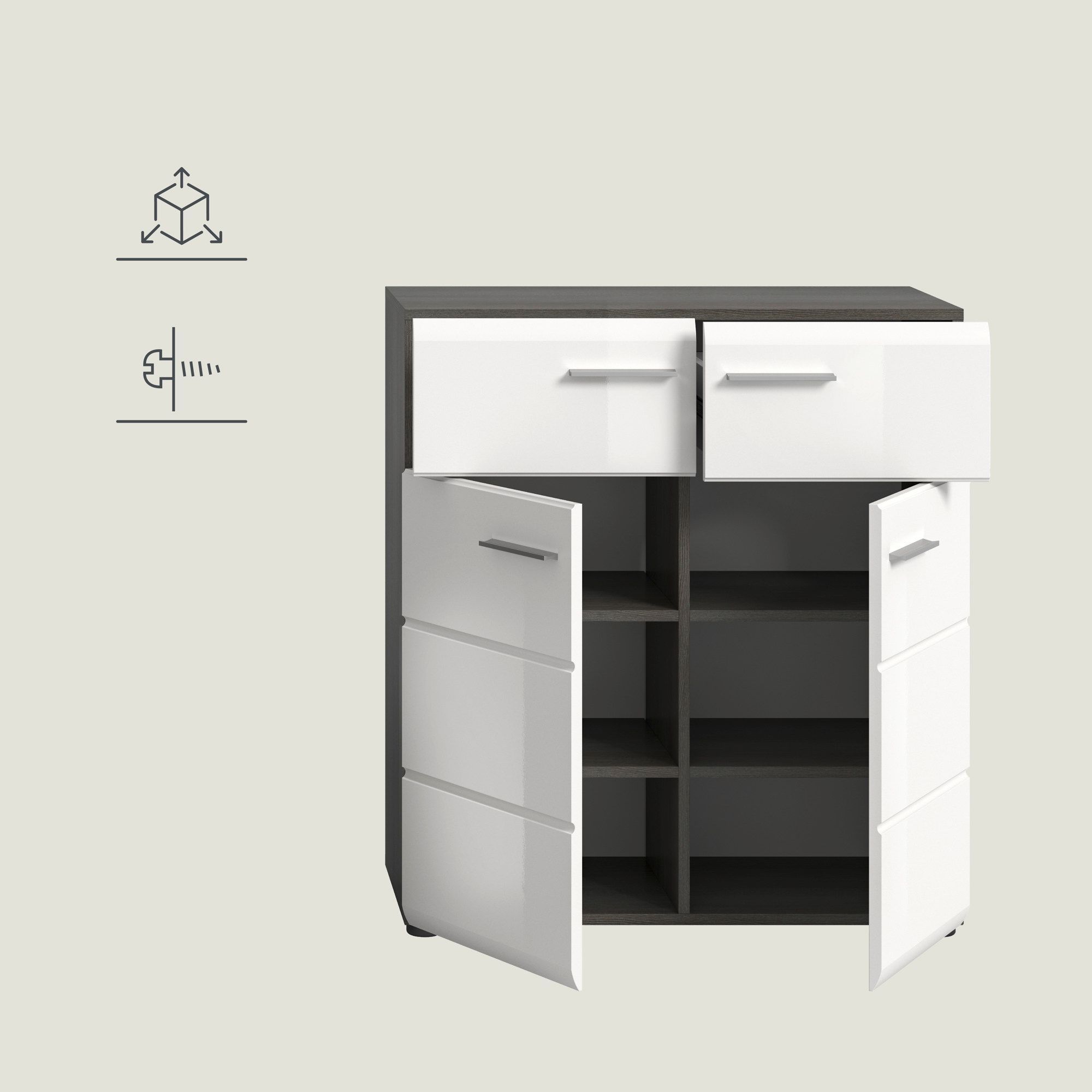 Schuhkommode in Rauchsilber Nachbildung und weiß Hochglanz tiefzieh