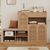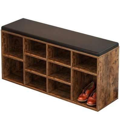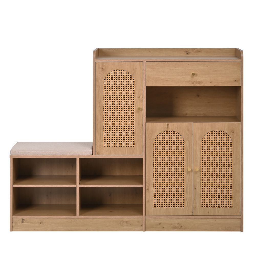 Schuhschrank in Holzoptik mit gepolsterter Sitzbank, 3 geflochtenen Rattantüren und 1 Schublade. Ideal für Flur oder Eingangsbereich und praktisch zur ordentlichen Schuhaufbewahrung. Maße: 142 x 35 x 110 cm. Material: Particle Board. Farbe: l. Gewicht: 43,35 kg. Multifunktional, platzsparend und dekorativ.