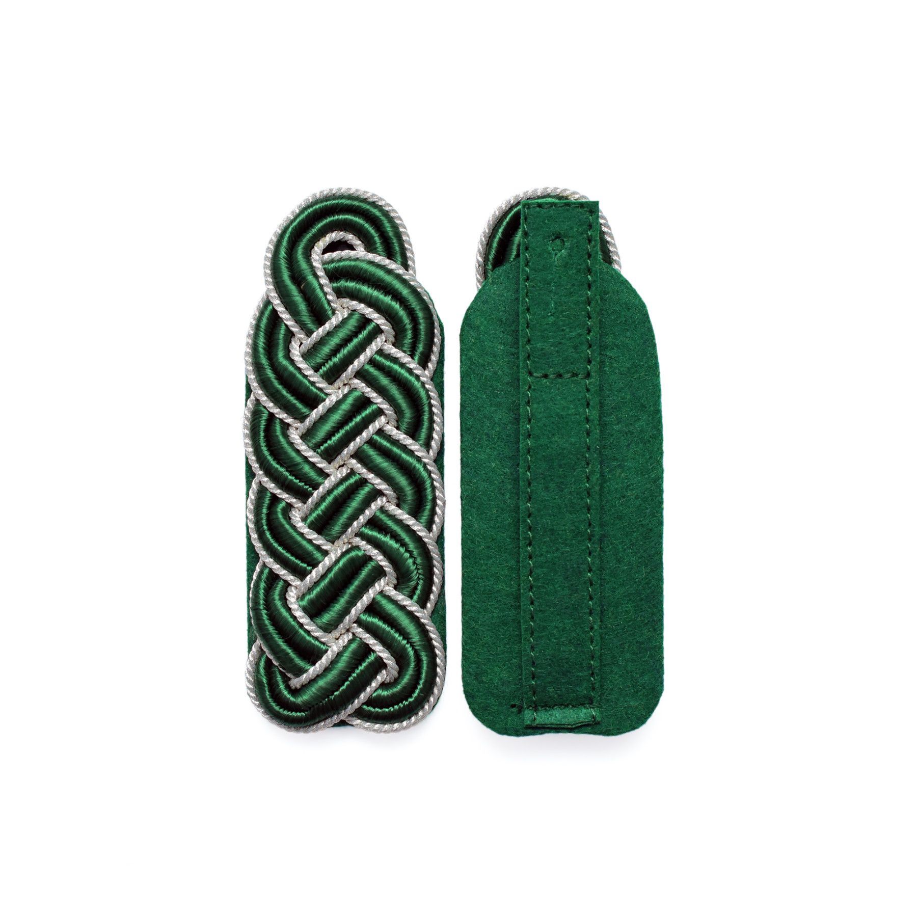 Schultergeflechte • Majorsgeflechte 5-bogig • aus ca 10mm breitem Soutache • grün Kunstseide mit silber Kordel • auf grünem Filz • mit Lasche zur Befestigung • ca. 11 x 4cm • Preis pro Paar