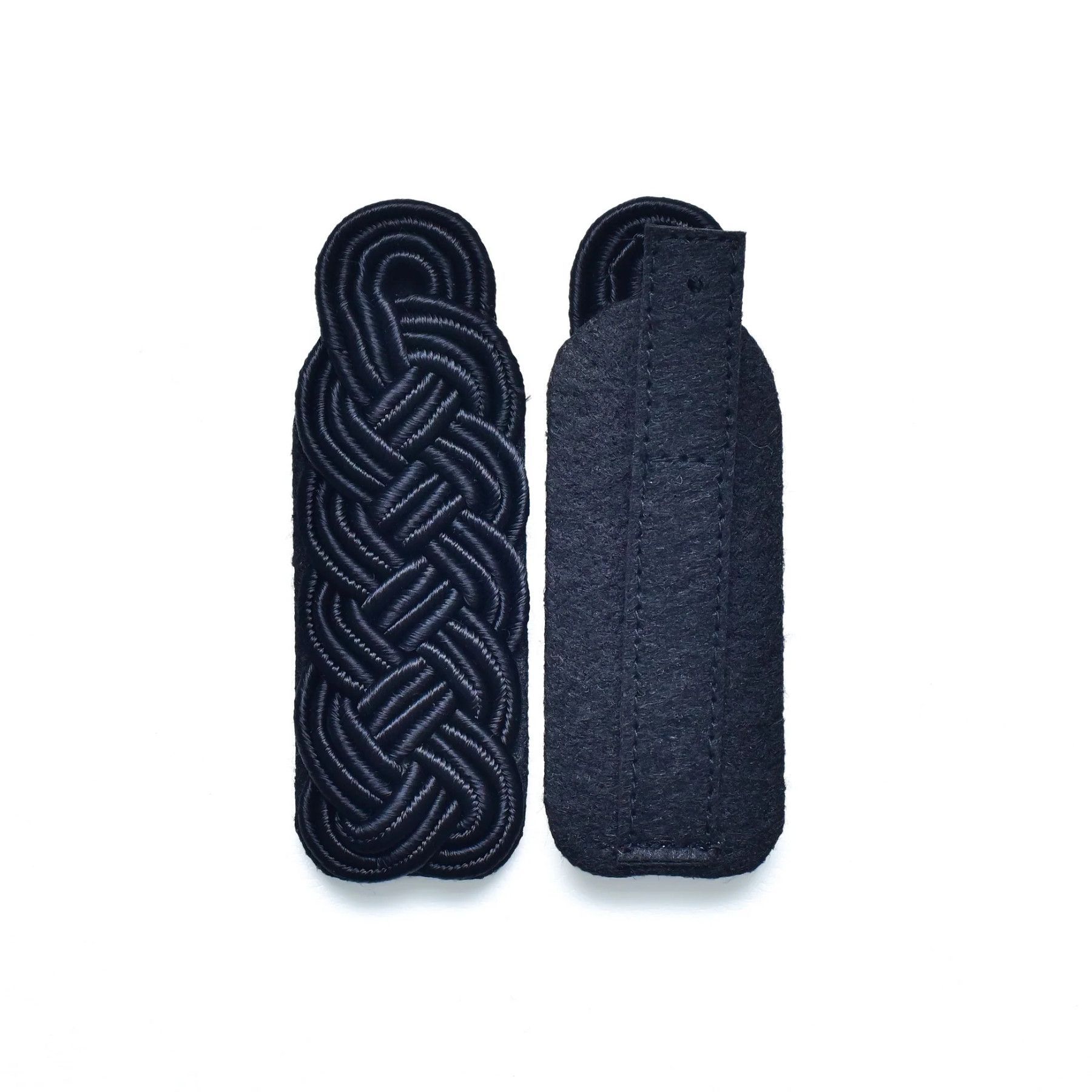 Schultergeflechte – Majorgeflecht SCHWARZ • Majorsgeflechte 5-bogig • aus 6mm breitem Soutache • schwarz Kunstseide • auf schwarzem Filz • mit Lasche zur Befestigung • ca. 11 x 4cm • Preis pro Paar