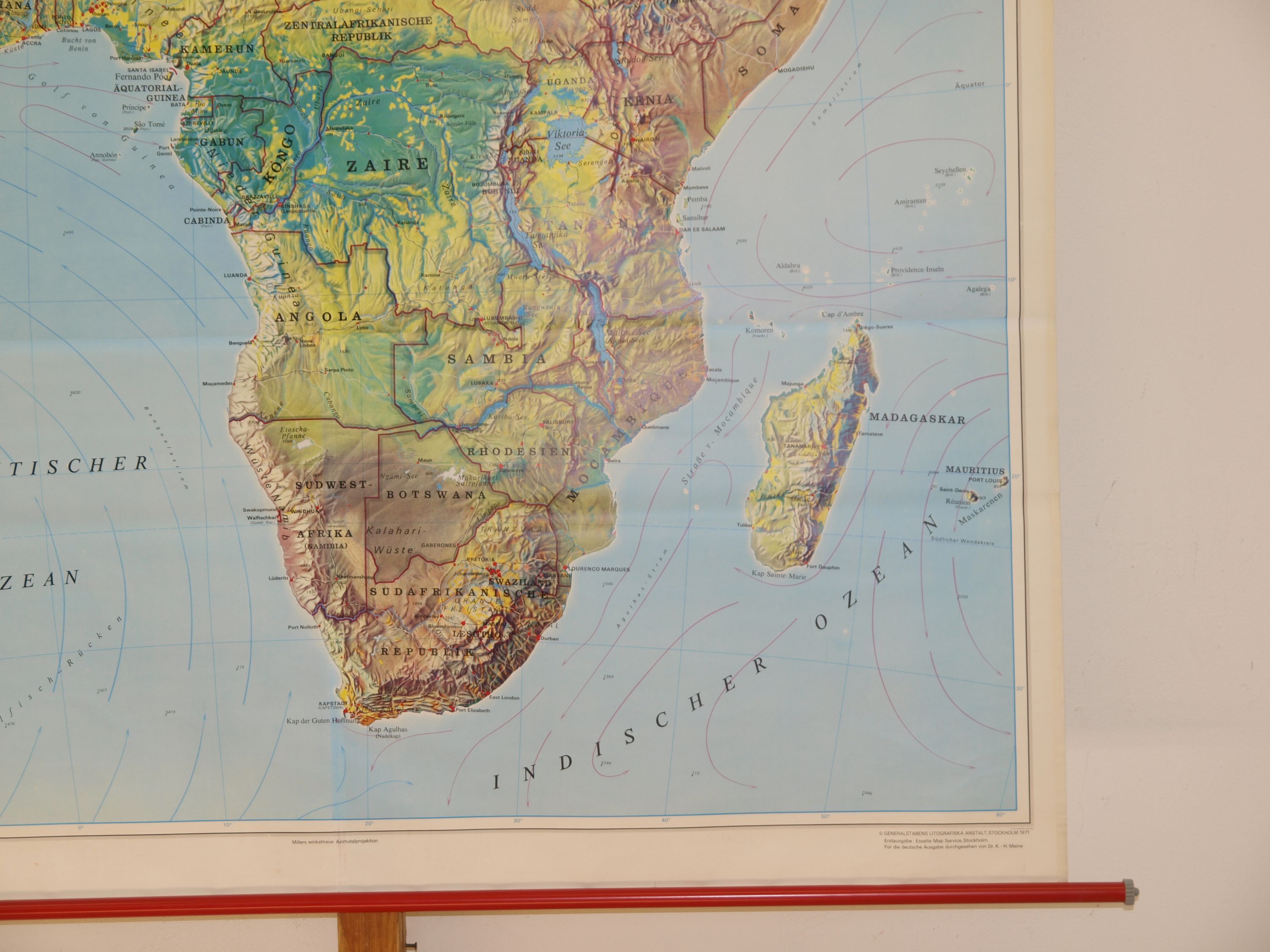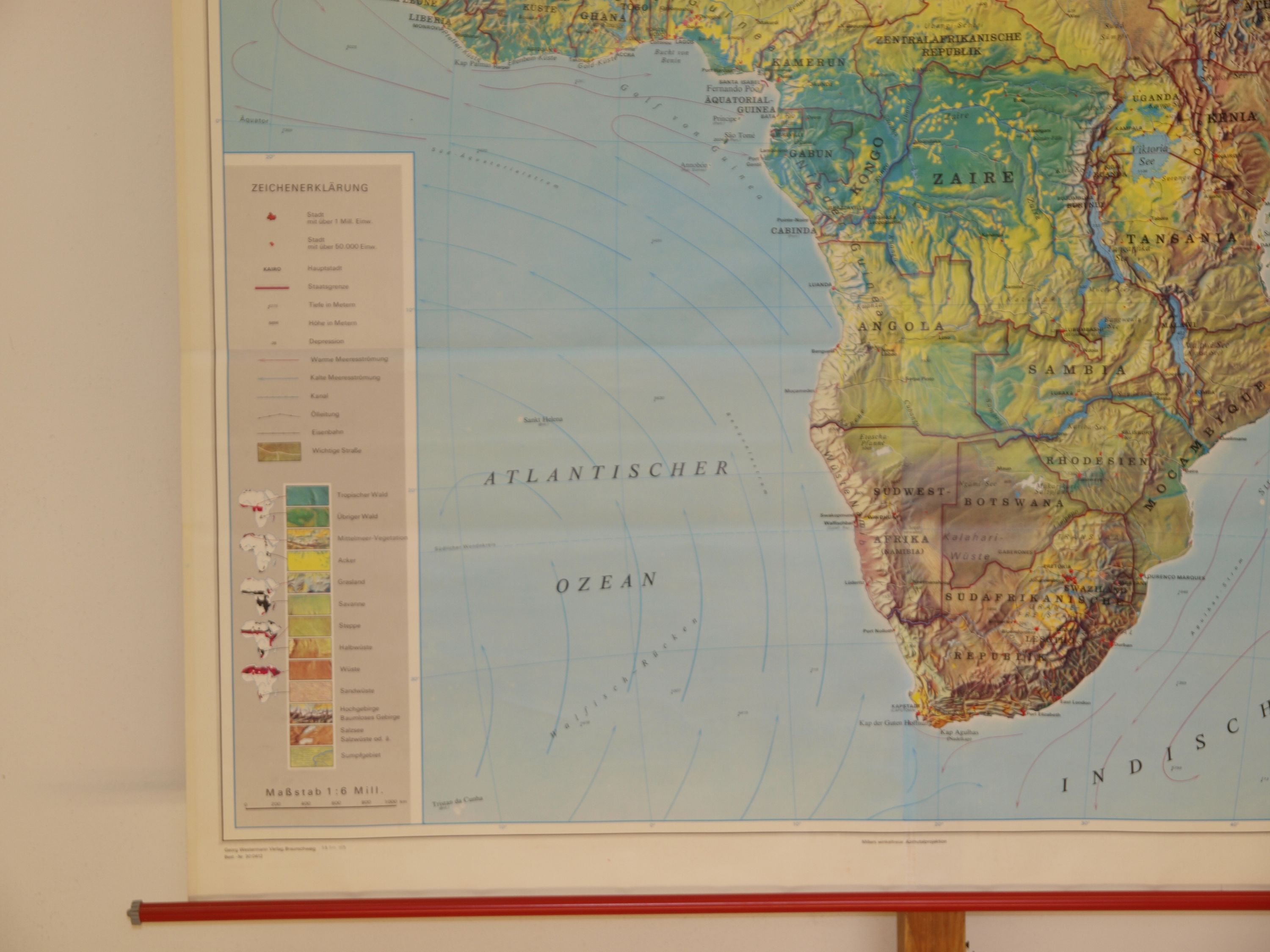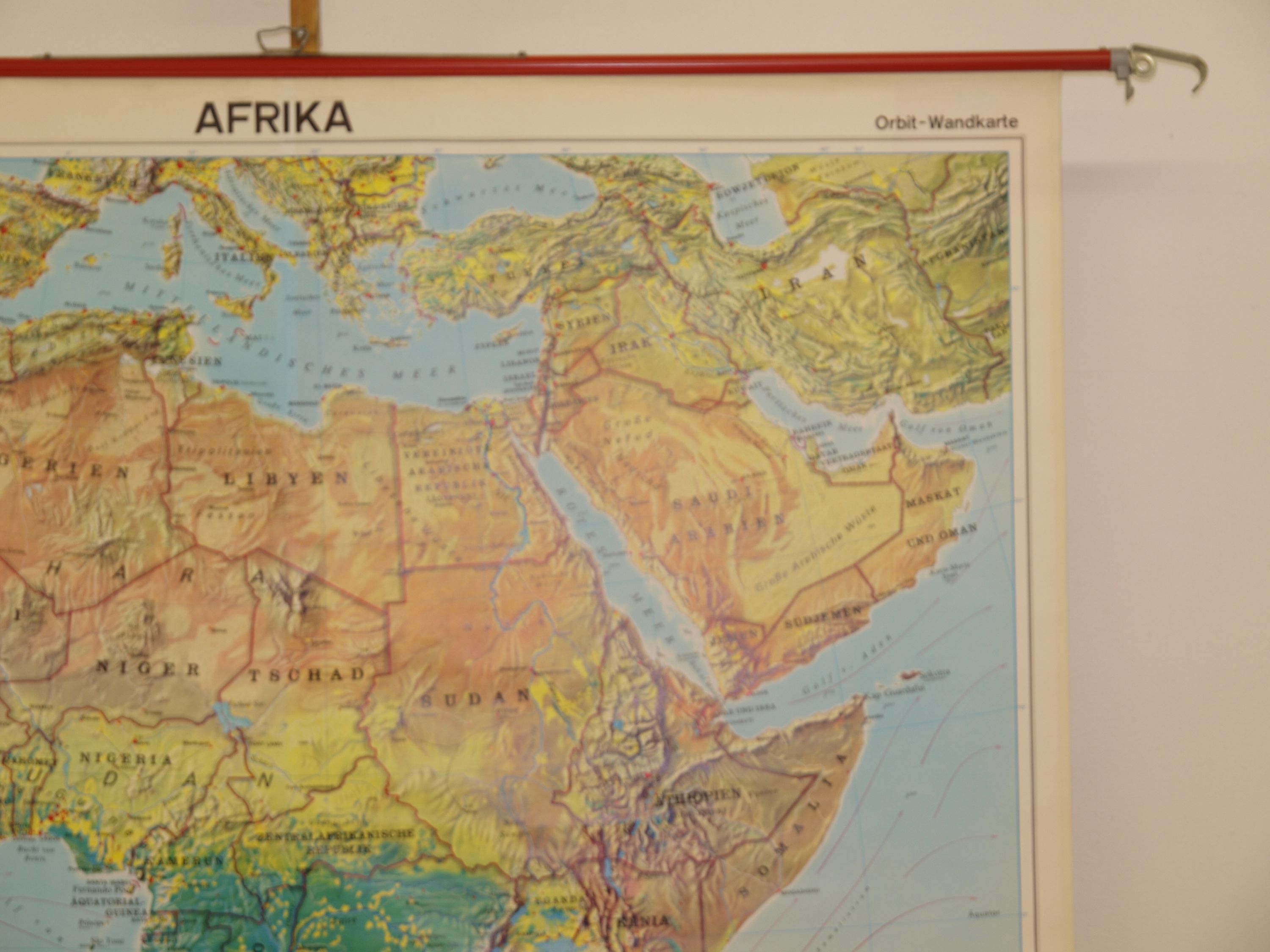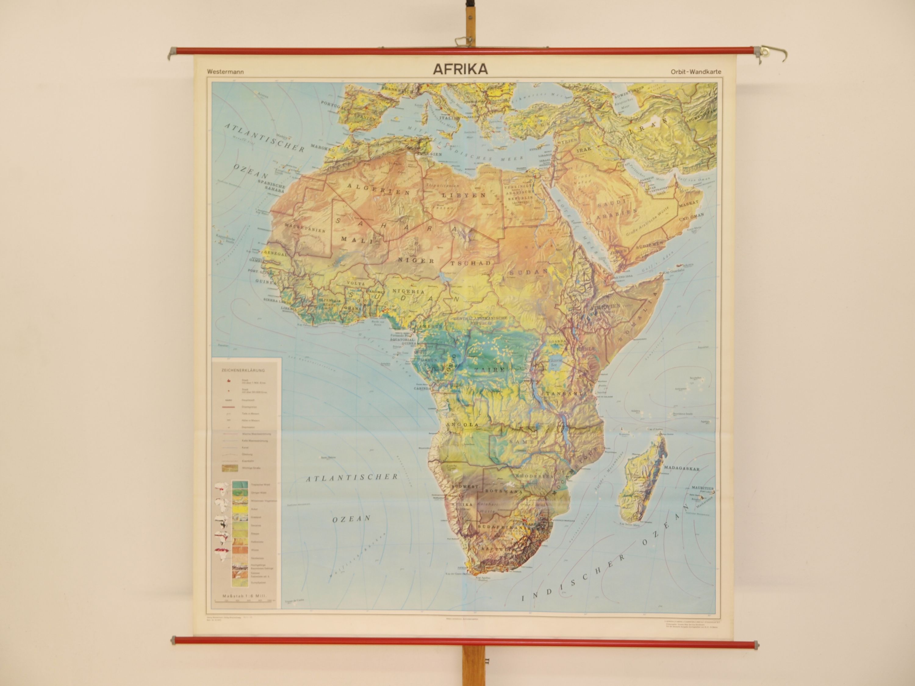 Schulwandkarte Orbit Wandkarte Afrika Bodenbedeckung 1971 158x170 Nr156 Afrika (WN623) ursprünglicher Entwurf GLA Schweden , Druck von Westermann, 1zu 6 Mio, 1971, Euro.Auflage , 158x170cm plus Stäbe, über Überschrift leicht rissig, sehr gut, Metallstäbe powered by plentymarkets