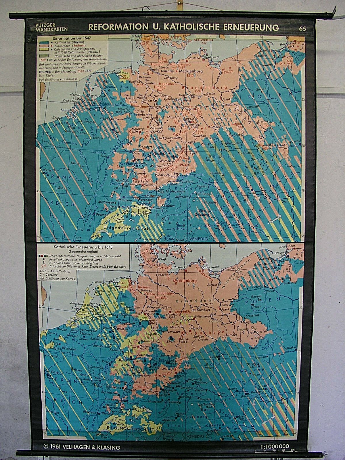 Schulwandkarte Reformation Luther Gustav Adolf Tilly katholische Liga 136x208cm Siehe in der Liste unter Nr. 675 Reformation und Katholische Erneuerung (WU87) beide Detailfotos von einer anderen Karte Kartensammler (allumfassend...speziell deutsche bezahlbare Karten ab 1900) verkauft hier seine dopp