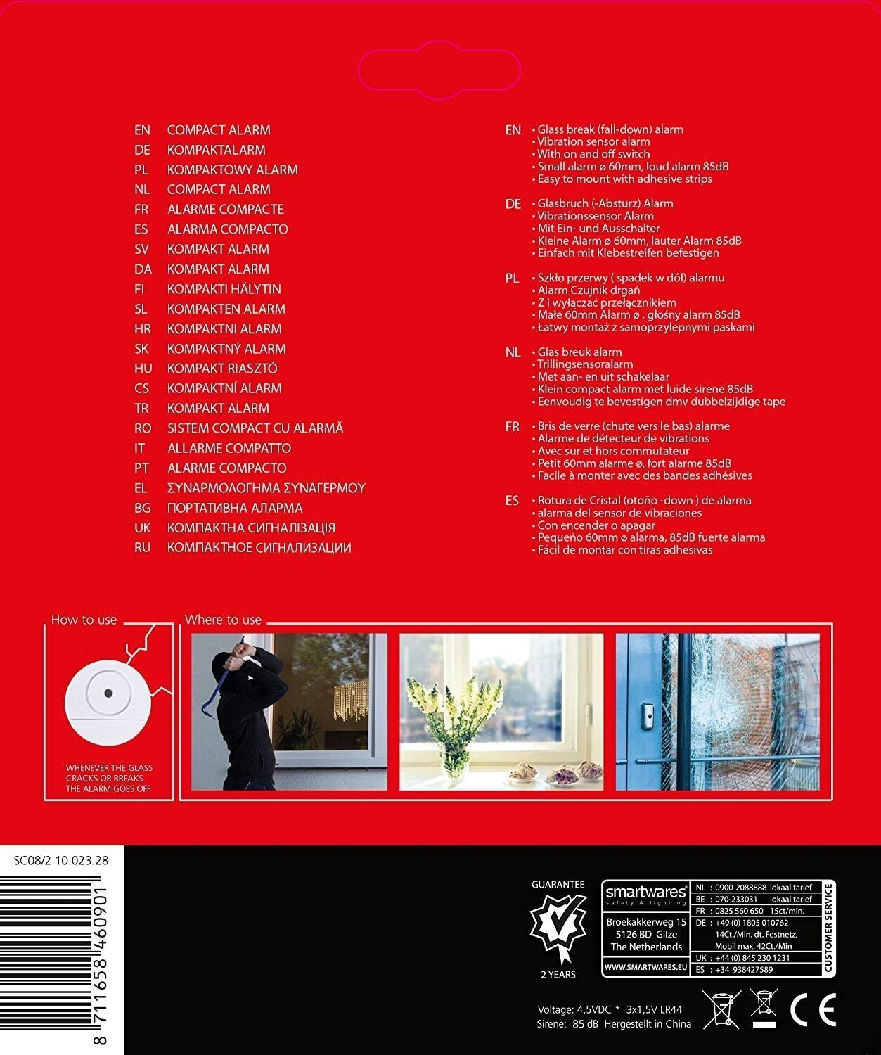 SCHUTZ VOR Einbrechern lauter Glasbruchmelder 85 db 2er Pack, incl. Batterien