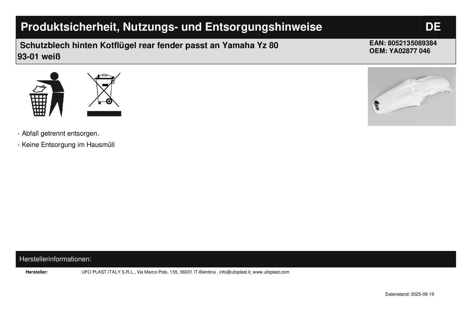 Schutzblech hinten Kotfl?gel rear fender passt an Yamaha Yz 80 93-01 wei?