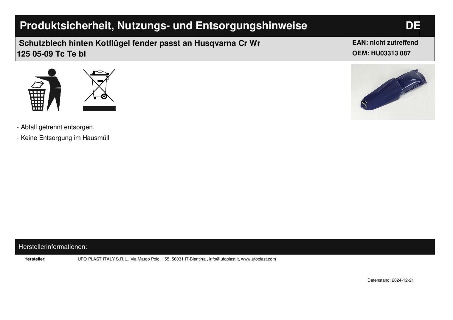 Schutzblech hinten Kotflügel fender passt an Husqvarna Cr Wr 125 05-09 Tc Te bl