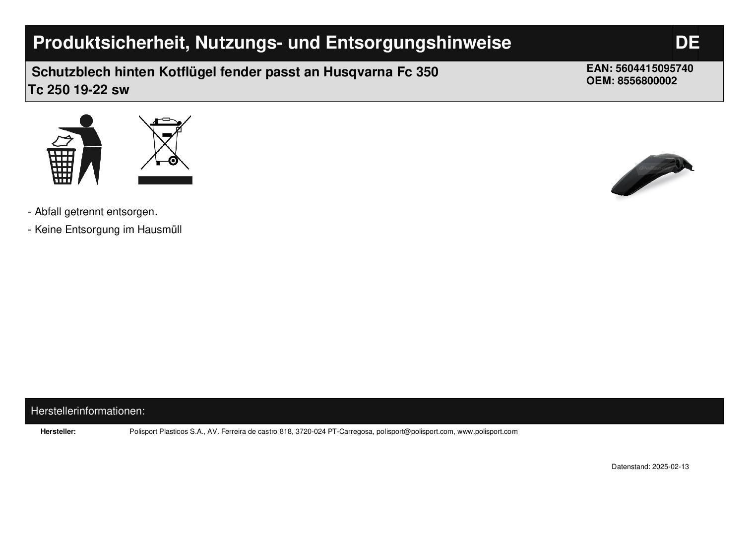 Polisport Schutzblech hinten Kotflügel fender passt an Husqvarna Fc 350 Tc 250 19-22 sw