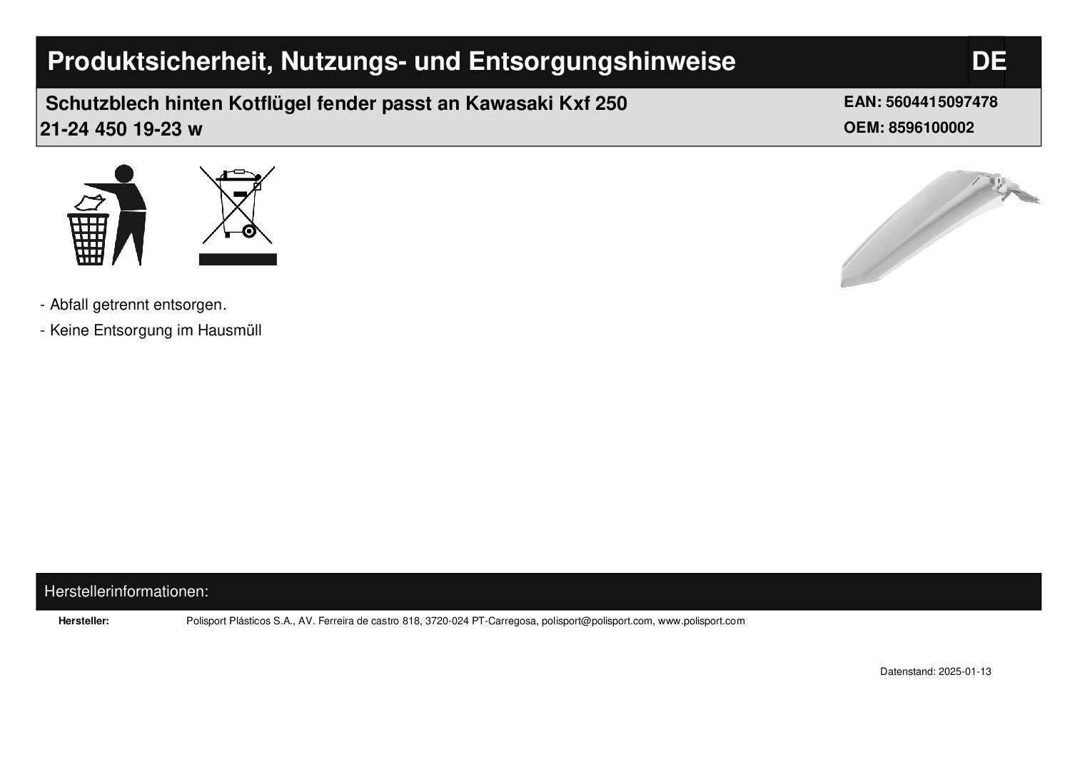 Polisport Schutzblech hinten Kotflügel fender passt an Kawasaki Kxf 250 21-24 450 19-23 w