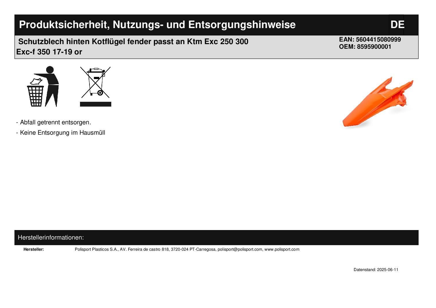 Polisport Schutzblech hinten Kotflügel fender passt an Ktm Exc 250 300 Exc-f 350 17-19 or
