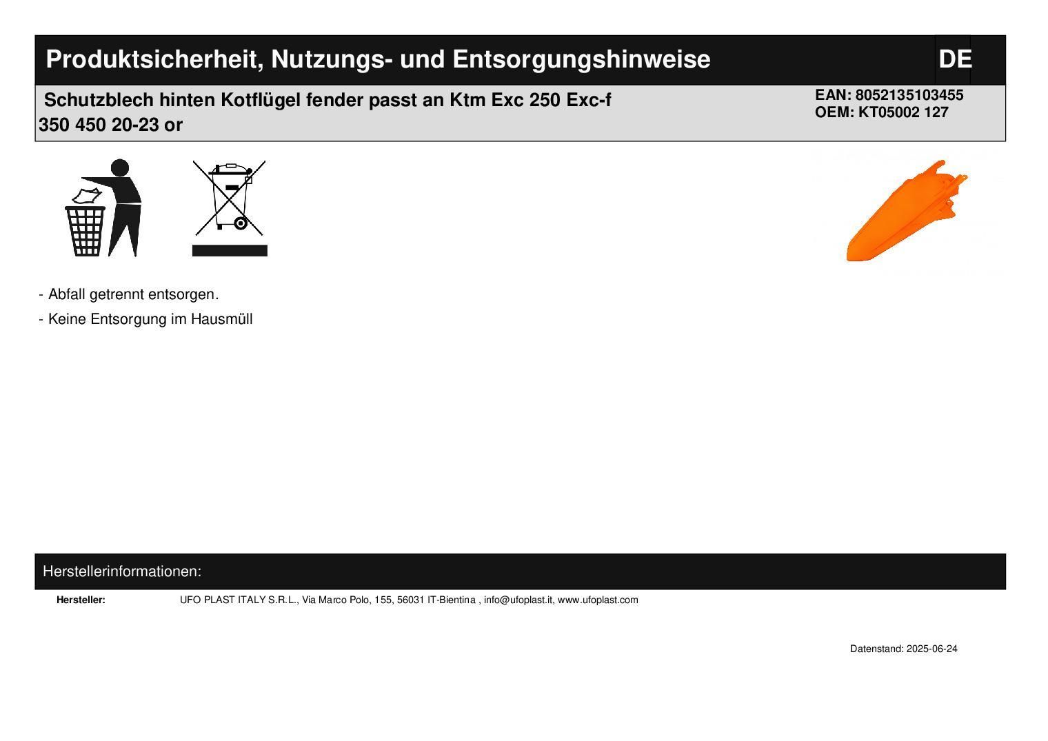 Schutzblech hinten Kotflügel fender passt an Ktm Exc 250 Exc-f 350 450 20-23 or