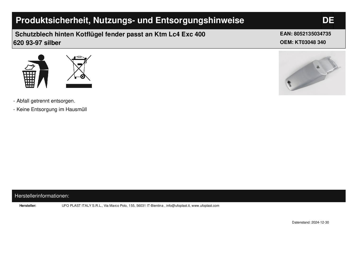 Schutzblech hinten Kotflügel fender passt an Ktm Lc4 Exc 400 620 93-97 silber