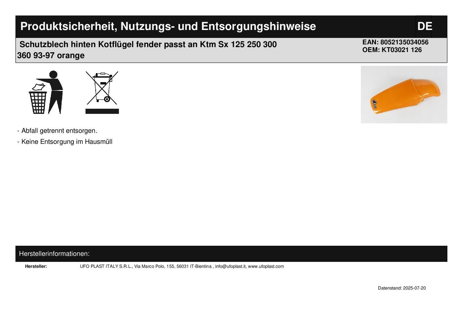 • Schutzblech hinten Kotfl?gel fender passt an Ktm Exc 125 250 300 450 08-11 or