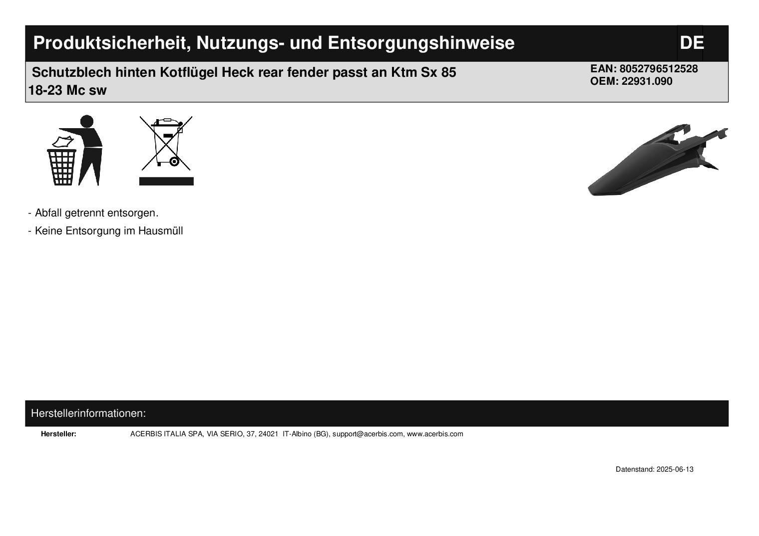Acerbis Schutzblech hinten Kotflügel Heck rear fender passt an Ktm Sx 85 18-23 Mc sw
