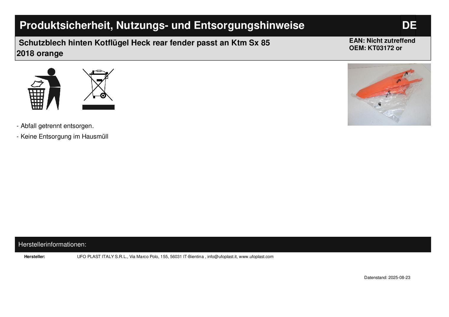 Schutzblech hinten Kotflügel Heck rear fender passt an Ktm Sx 85 2018 orange