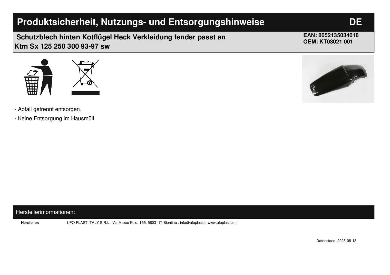 Schutzblech hinten Kotflügel Heck Verkleidung fender passt an Ktm Sx 125 250 300