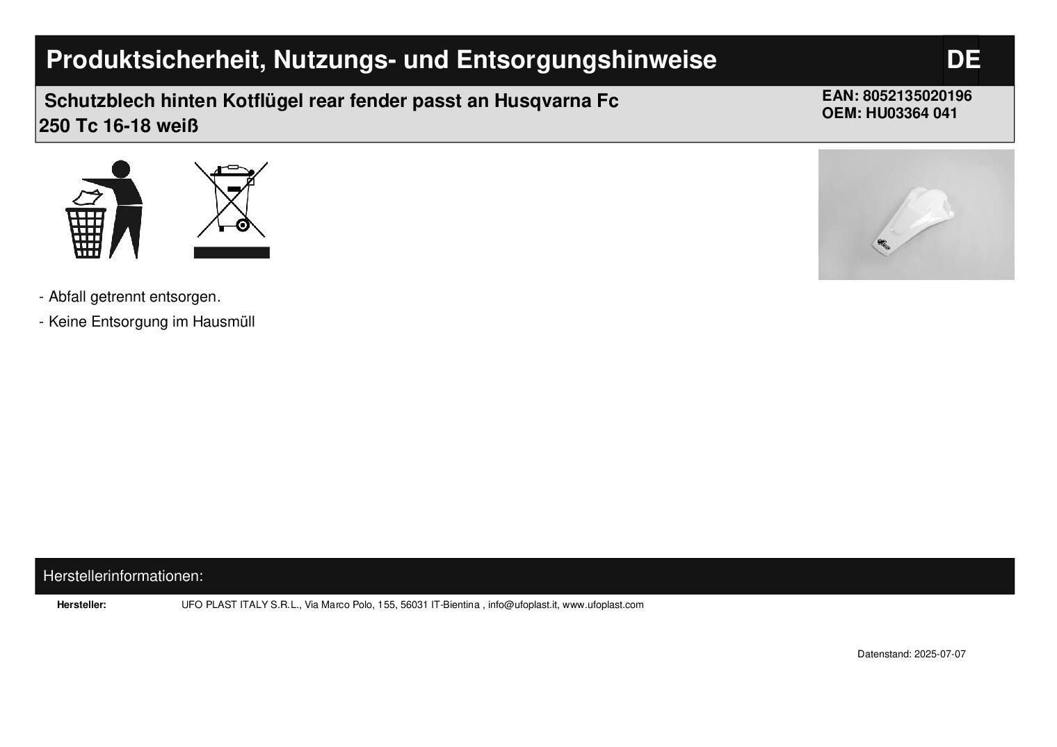 Schutzblech hinten Kotflügel rear fender passt an Husqvarna Fc 250 Tc 16-18 weiß