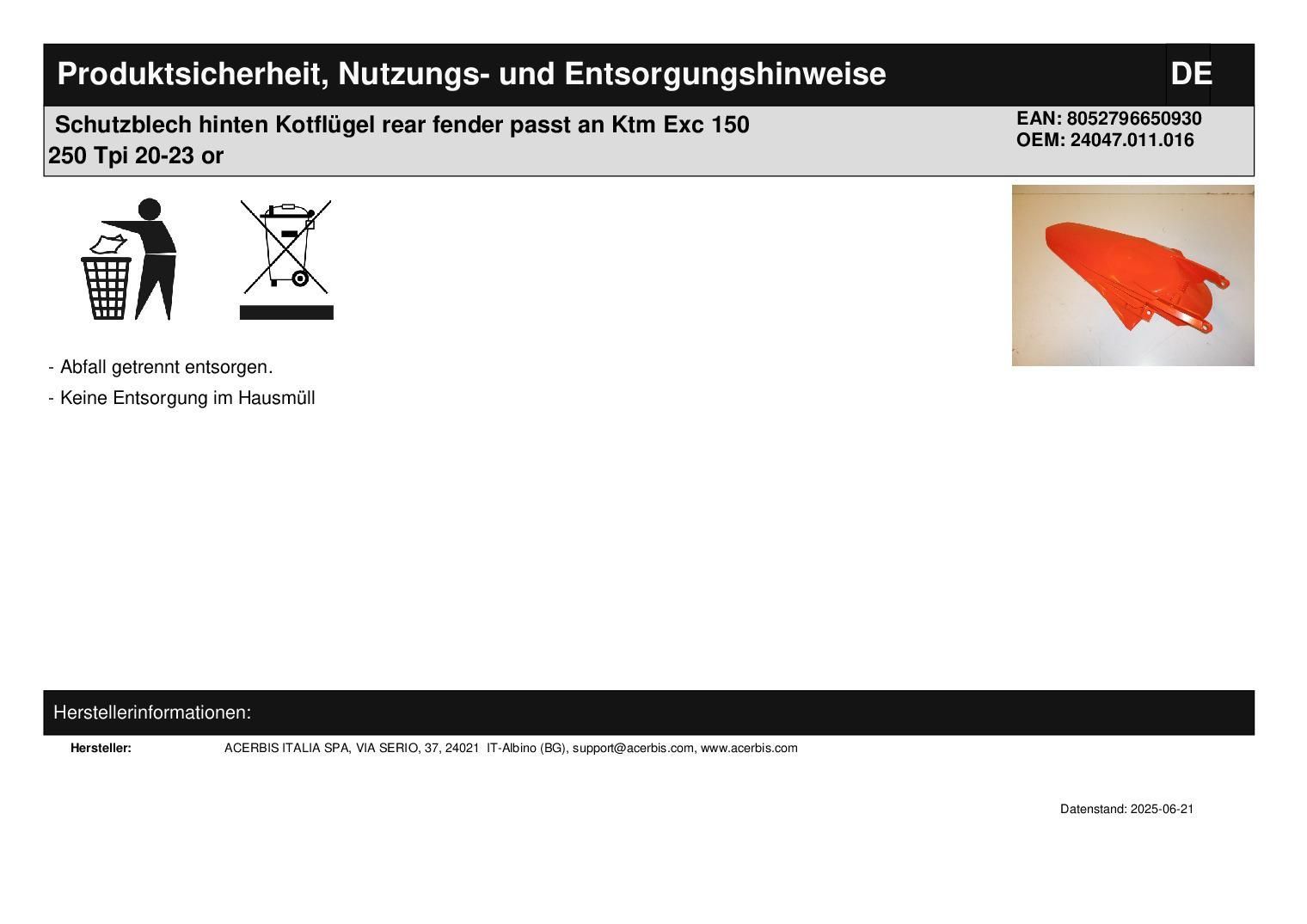 Acerbis Schutzblech hinten Kotflügel rear fender passt an Ktm Exc 150 250 Tpi 20-23 or