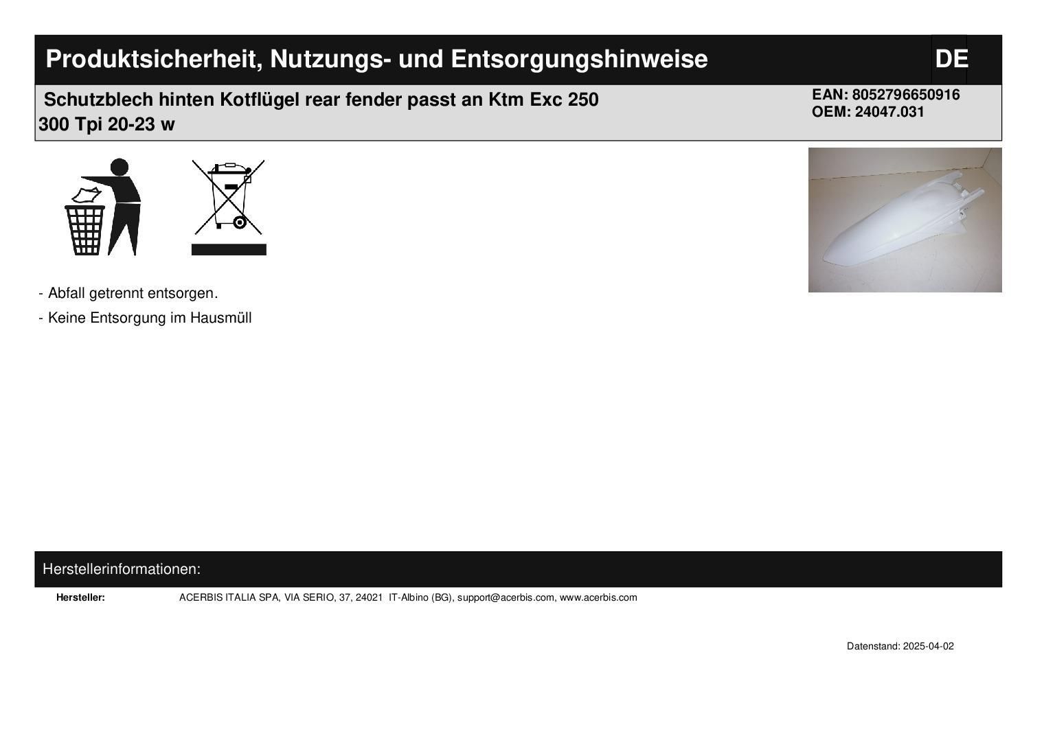 Acerbis Schutzblech hinten Kotflügel rear fender passt an Ktm Exc 250 300 Tpi 20-23 w