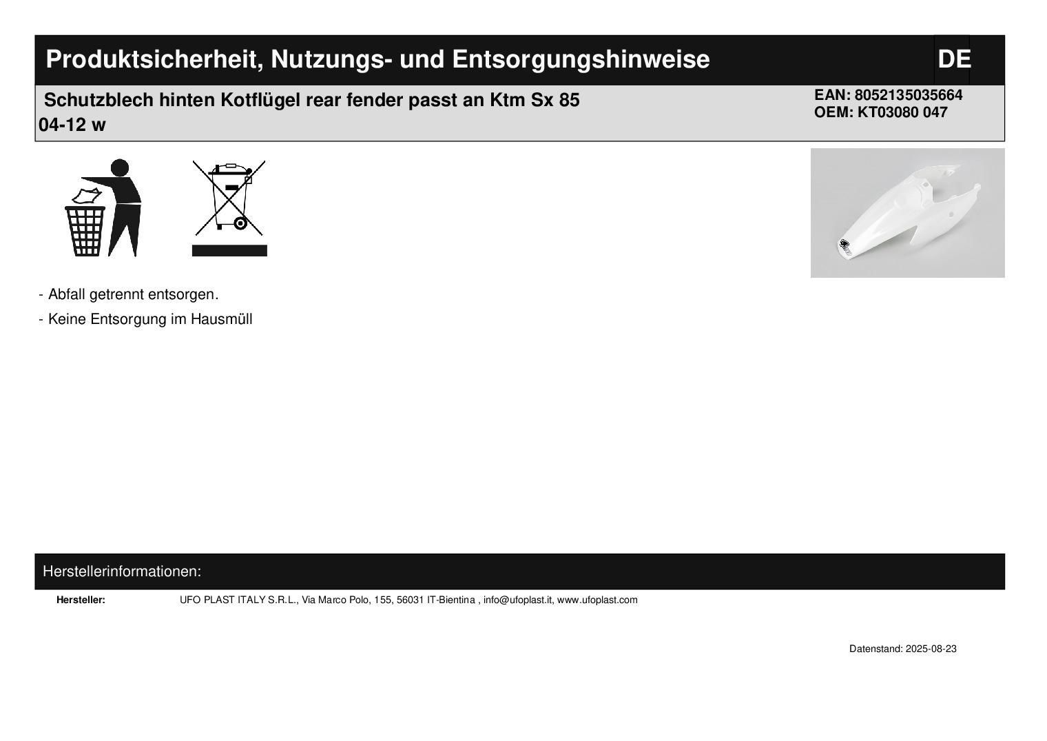 Schutzblech hinten Kotflügel rear fender passt an Ktm Sx 85 04-12 w