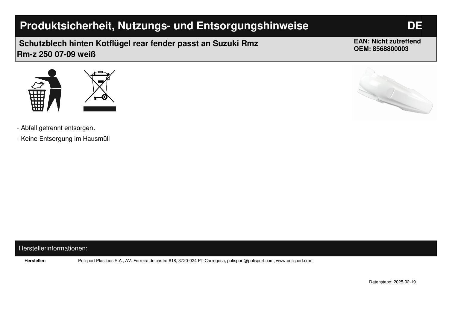 Schutzblech hinten Kotflügel rear fender passt an Suzuki Rmz Rm-z 250 07-09 weiß