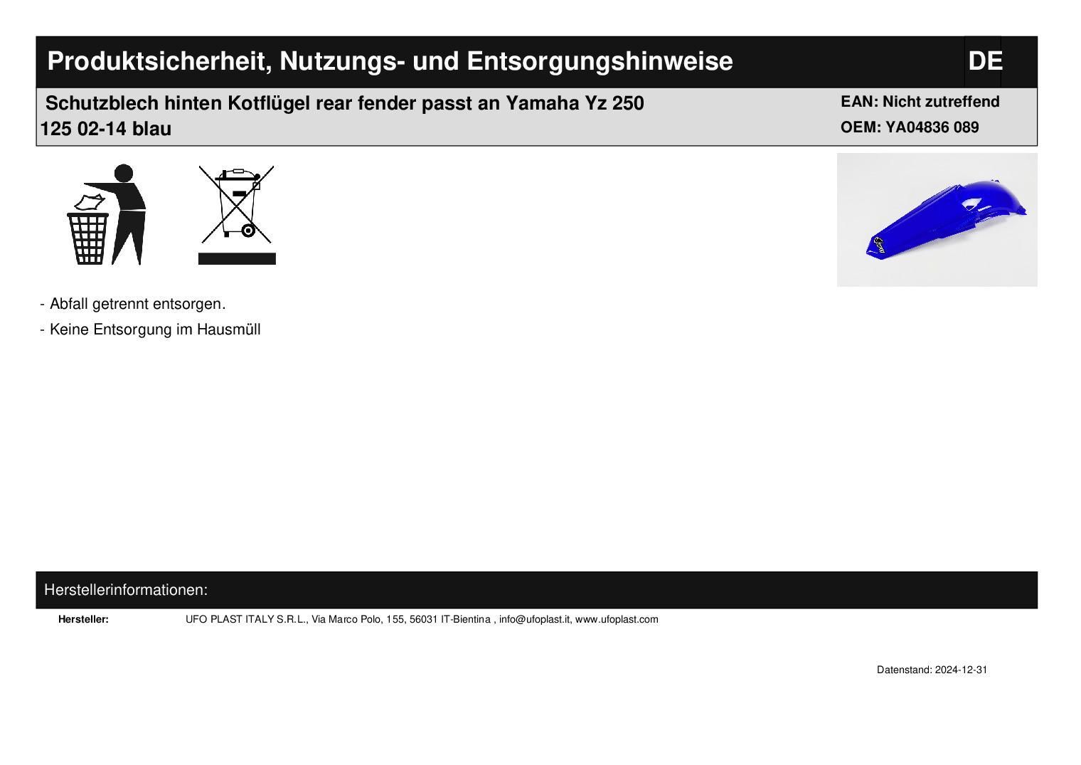 Schutzblech hinten Kotflügel rear fender passt an Yamaha Yz 250 125 02-14 blau