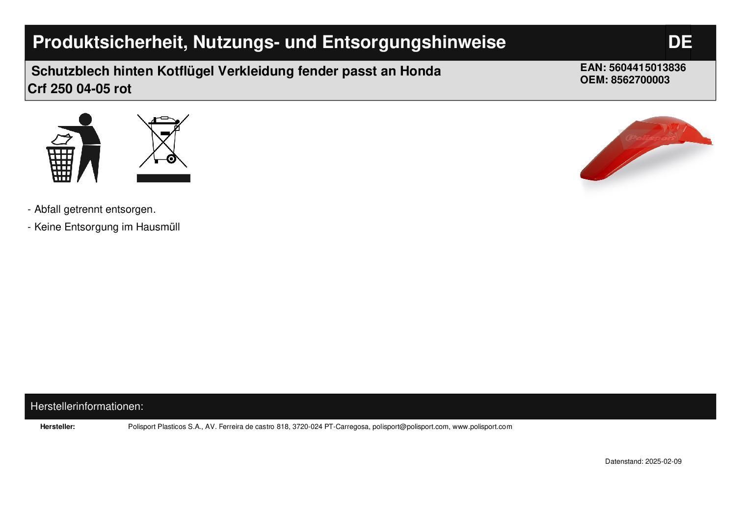 Polisport Schutzblech hinten Kotflügel Verkleidung fender passt an Honda Crf 250 04-05 rot