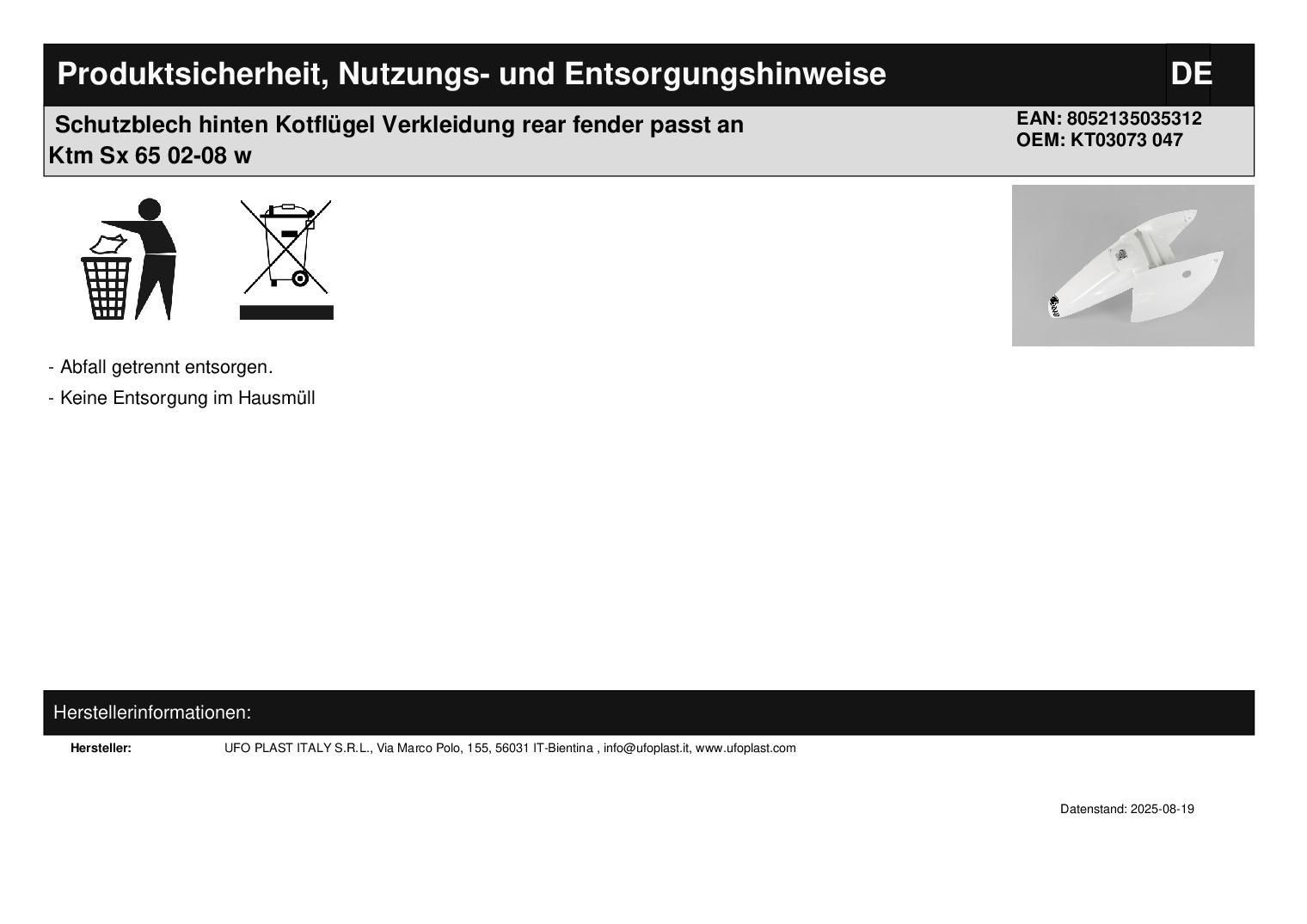 • Schutzblech hinten Kotfl?gel Verkleidung rear fender passt an Ktm Sx 65 02-08 or