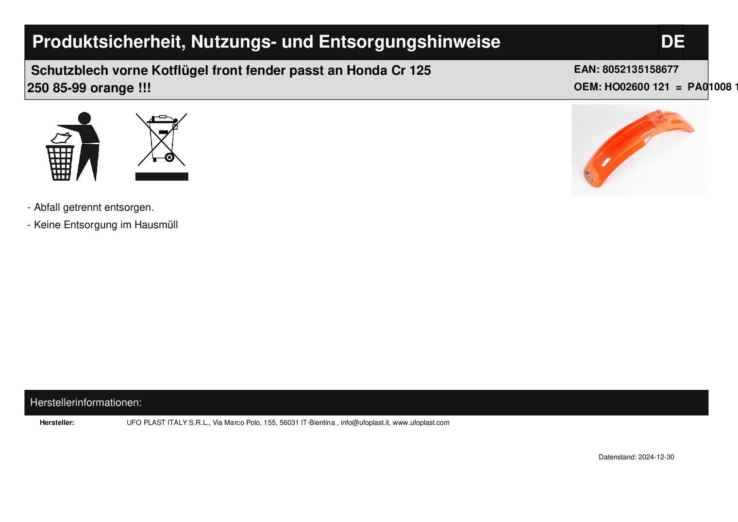 Schutzblech Kotflügel front fender passt an Honda Cr 125 250 85-99 orange/rot