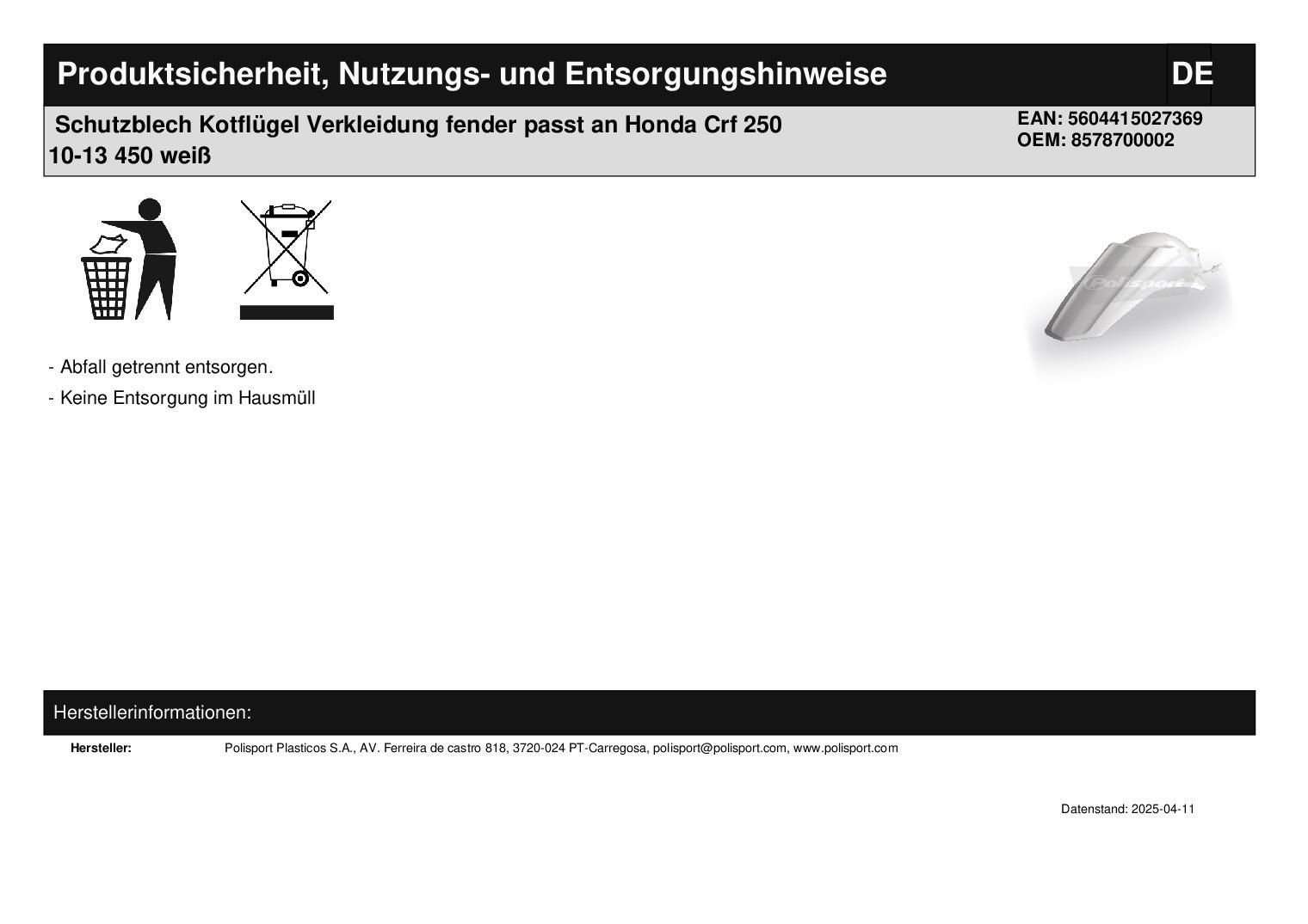Polisport Schutzblech Kotflügel Verkleidung fender passt an Honda Crf 250 10-13 450 weiß
