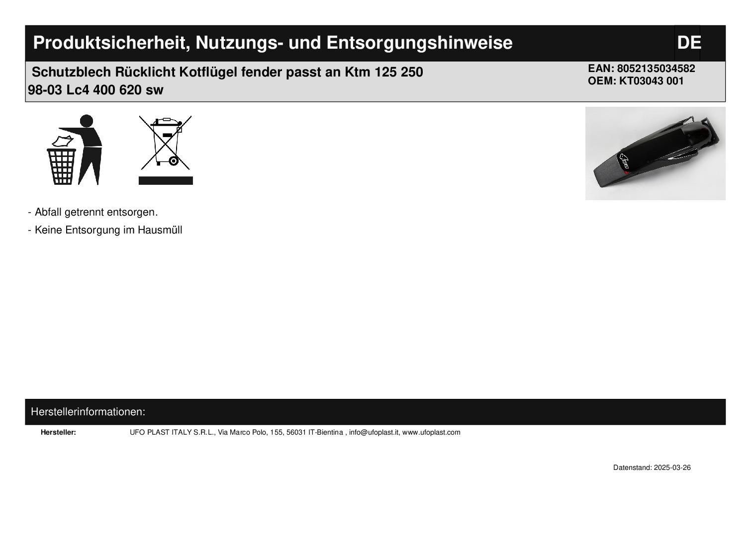 Schutzblech Rücklicht Kotflügel fender passt an Ktm 125 250 98-03 Lc4 400 620 sw