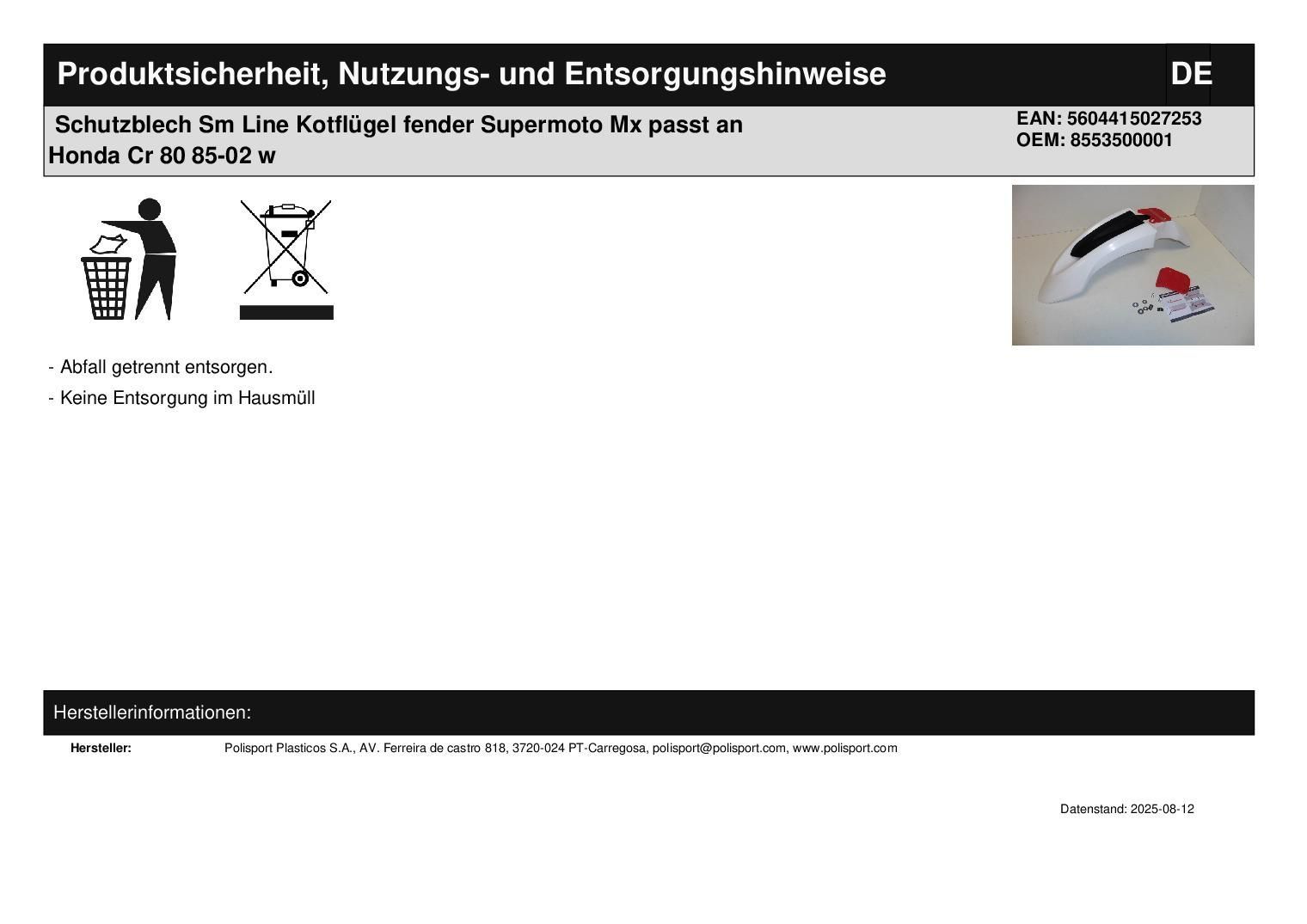 Polisport Schutzblech Sm Line Kotflügel fender Supermoto Mx passt an Honda Cr 80 85-02 w