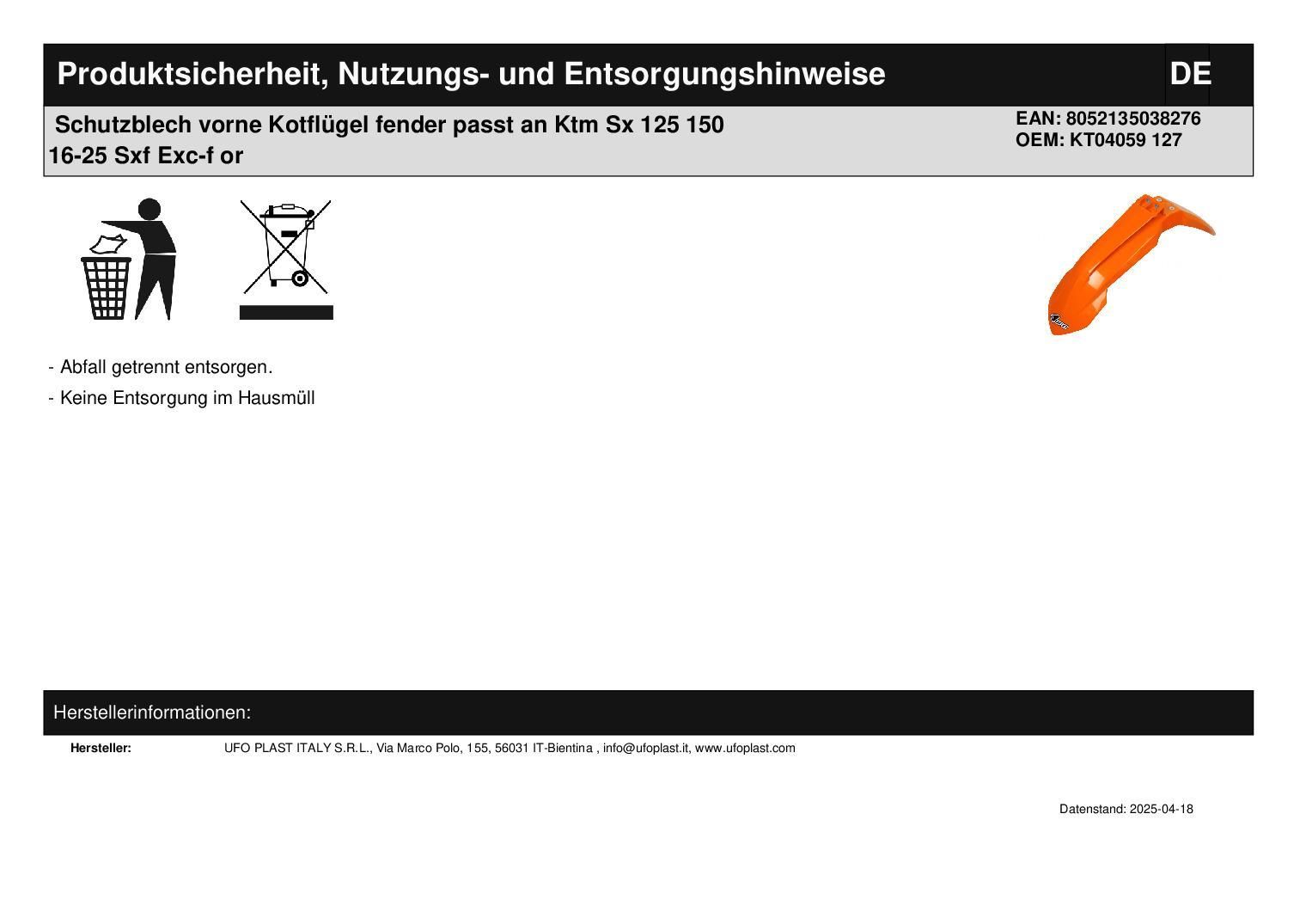 Schutzblech vorne Kotfl?gel fender passt an Ktm Sx 125 150 16-22 Sxf Exc-f or