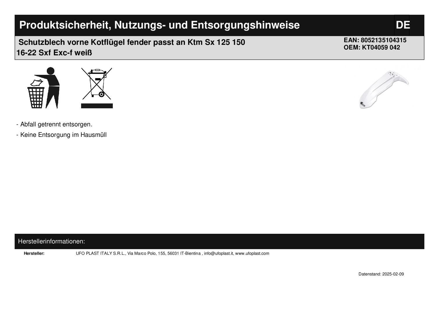 Schutzblech vorne Kotfl?gel fender passt an Ktm Sx 125 150 16-25 Sxf Exc-f sw